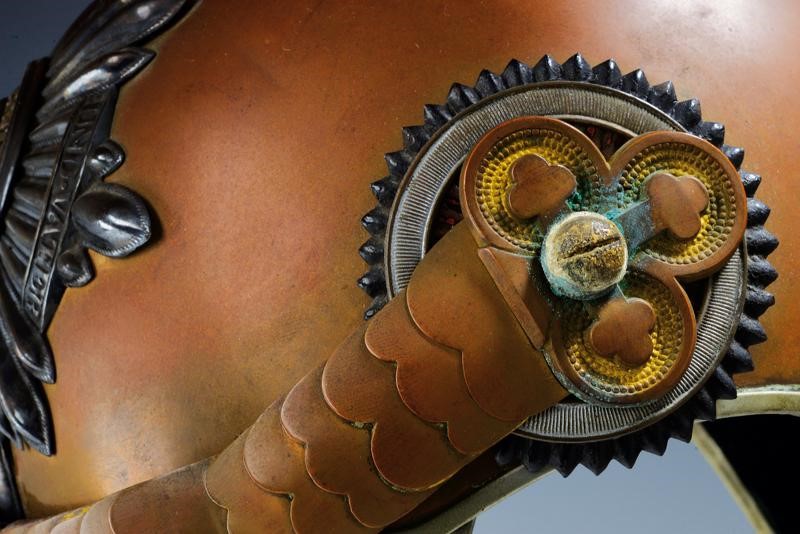 Coppo in tombacco scuro con restauri e doppi fori all'interno. Completo di aquila da parata in argento, con difetti soprattutto su un'ala, sul frontale grande stella dell'Aquila Nera smaltata al centro; entrambe le coccarde da ufficiale. Soggoli a scaglie convesse. Alluda in pelle marrone chiaro e cuffia in seta (in cattive condizioni). La tesa rivestita di cuoio, la gronda in velluto.