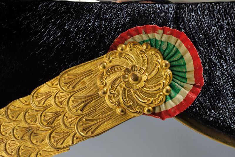 Coppo nichelato con cimiero ripreso a cesello e dorato, oliva recante in rilievo il monogramma "VE", turbante in pelliccia di foca, croce bombata, soggolo a squame e coccarda tricolore in seta. Visiere rivestite in marocchino verde (quella anteriore con piccole mancanze, alluda in pelle marrone e cuffie in seta gialla (il colore di quest'ultima indica l'appartenenza a Genova cavalleria).