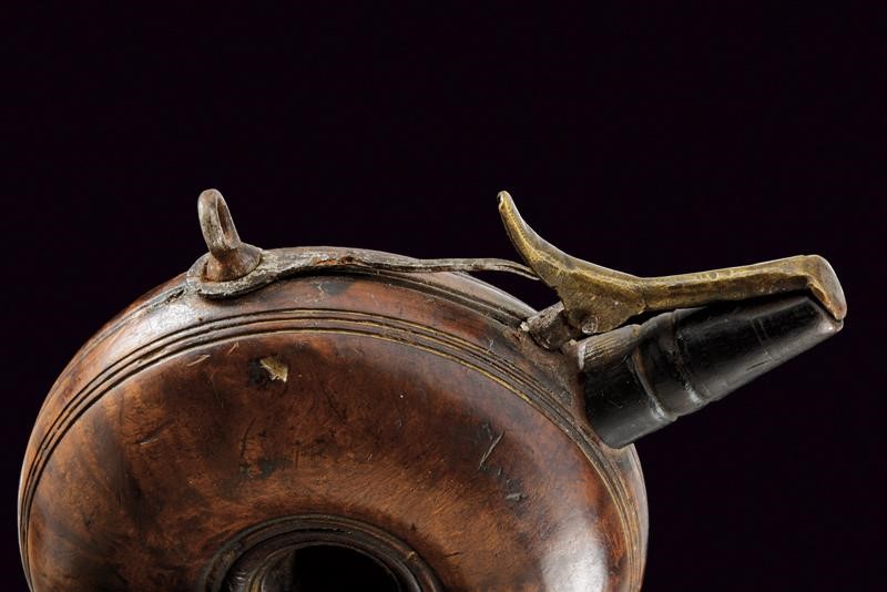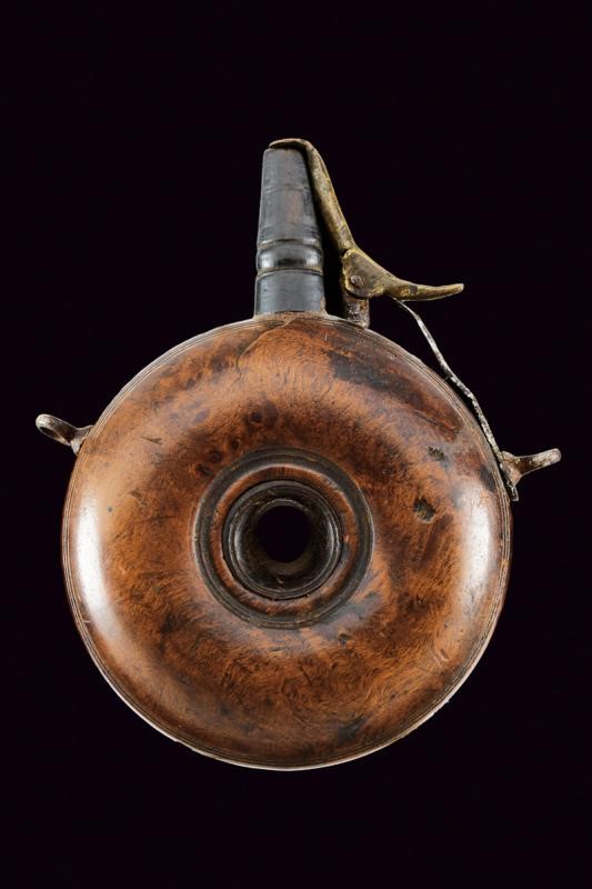 Corpo in legno a forma di ciambella, il bordo con otto sottili scanalature che seguono tutta la superficie esterna. Cannello in legno con chiusura a molla in ottone e ferro. Due passanti di sospensione per la cinghia. Rara.