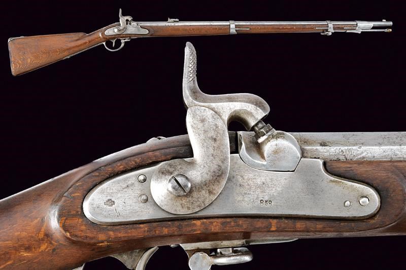 Canna tonda rigata (anima pulita, rigatura visibile), con base ottagonale marcata "17", "7", "K", "F" e con altri punzoni poco leggibili, dotata di alzo abbattibile e mirino, cal. 13.9 mm. Batteria a molla in avanti datata "858" e con punzone imperiale. Cassa intera in legno con fornimenti e bacchetta in ferro. Il calciolo con resti di numeri di reparto e marcatura "LF".