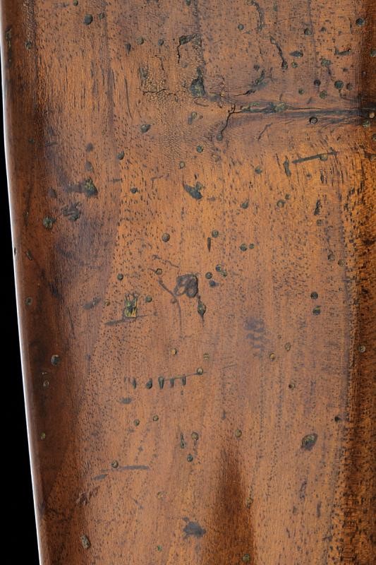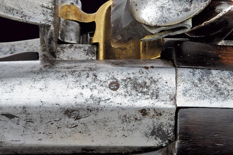 Canna tonda, liscia, con base quadra, munita di punzone "R", attacco per la baionetta, cal. 18 mm. Batteria marcata "M.ra R.le Di Napoli". Cassa intera in legno con fori di tarlo restaurati. Fornimenti in ottone e ferro. Bacchetta in ferro.
