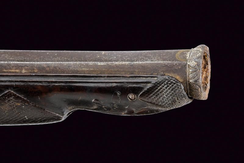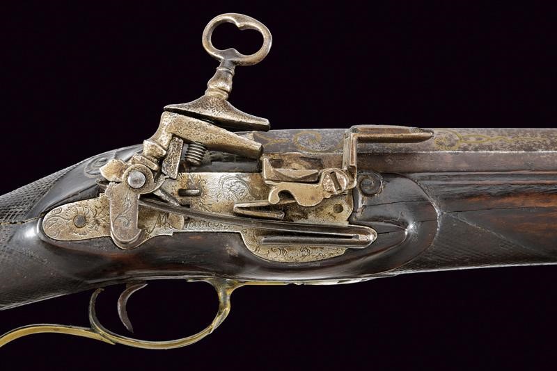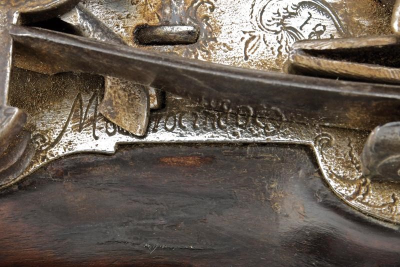 Pesante canna corta, ottagonale e liscia, con estremità decorate a motivi floreali e rimesse in ottone, la volata con gioia di bocca incisa a fiorame, cal. 23 mm. Codetta incisa. Batteria alla micheletta firmata "Moostocino" (? - non chiaramente leggibile) e datata "1819"; cartella incisa a motivi floreali; funzionamento da rivedere. Cassa intera in legno scolpito, con danni e parziale rottura al collo restaurata in epoca d'uso; astina e collo zigrinati. Bei fornimenti in ottone incisi a motivi floreali; la contropiastra traforata. Bacchetta mancante.