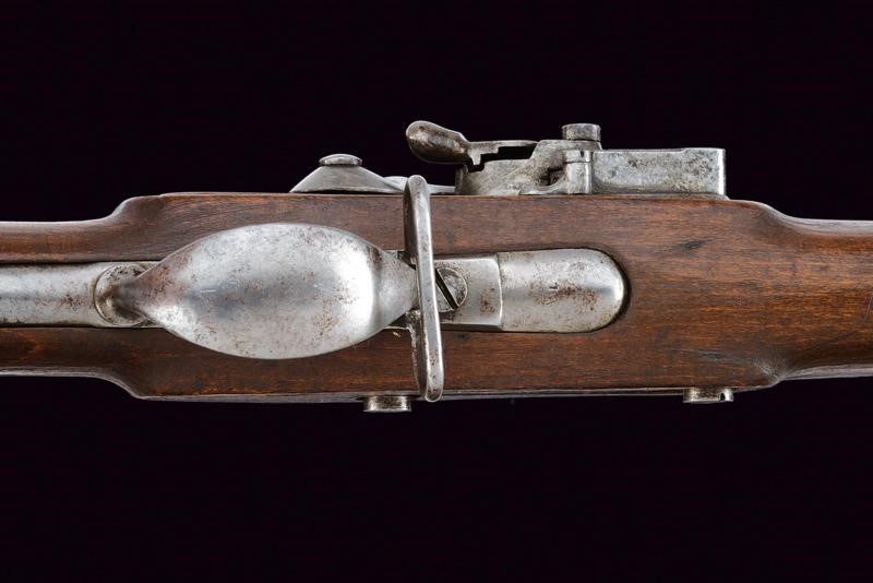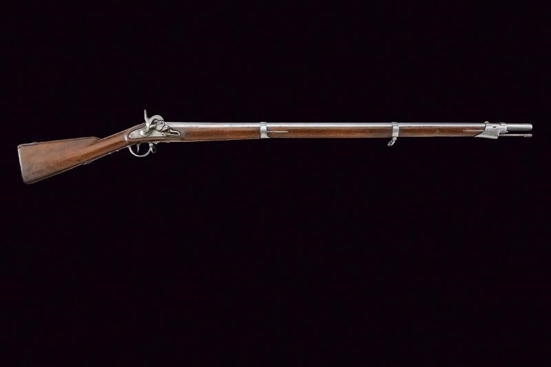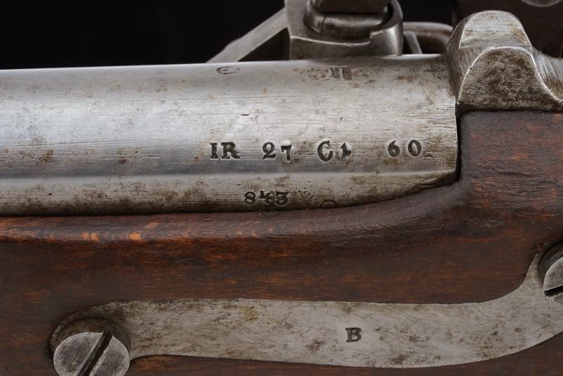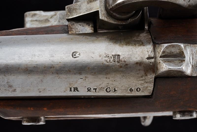Canna tonda liscia con base quadra marcata "FG", "R", "IR 27 C 1 60", "843", "S", sul lato "WN" e con un altro punzone, dotata di mirino, cal. 17,8 mm. Codolo con alzo fisso marcato "1836". Batteria con punzone imperiale e data "843". Meccanica ben funzionante. Cassa intera in legno con fornimenti e bacchetta in ferro; vari punzoni "R" e "L".