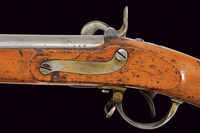 Canna liscia tonda, con vari punzoni alla base, tra i quali "B", "O", "S" e data "847"; mirino e dente d'innesto per la baionetta, cal. 17,6 mm. Codolo con alzo fisso. Batteria con sistema Augustin, punzone imperiale e data "843". Meccanica funzionante. Cassa intera in legno (piccole mancanze), il lato sinistro della pala con resti di timbri. Fornimenti in ferro recanti marcature. Bacchetta in ferro. Baionetta a manicotto (lungh. 56 cm.) con lama cruciforme e punzoni alla base, completa di fodero in cuoio (probabilmente di epoca successiva) con fornimenti in ferro.