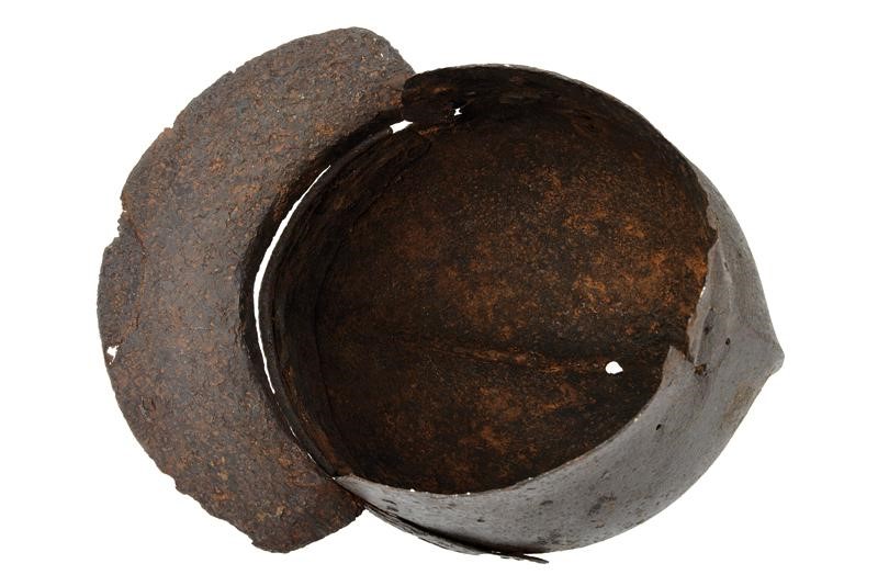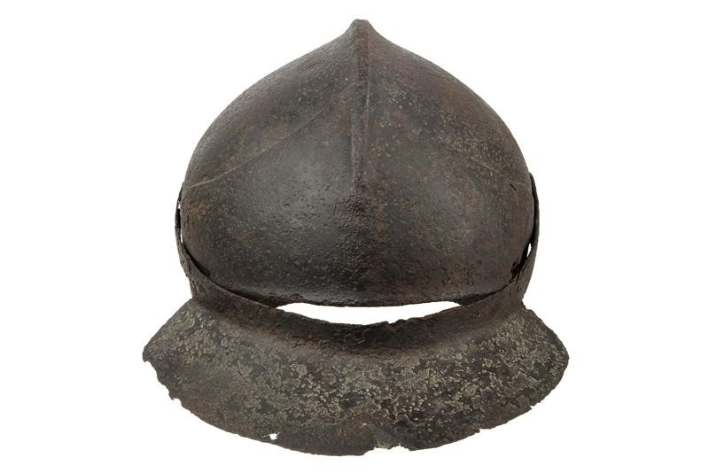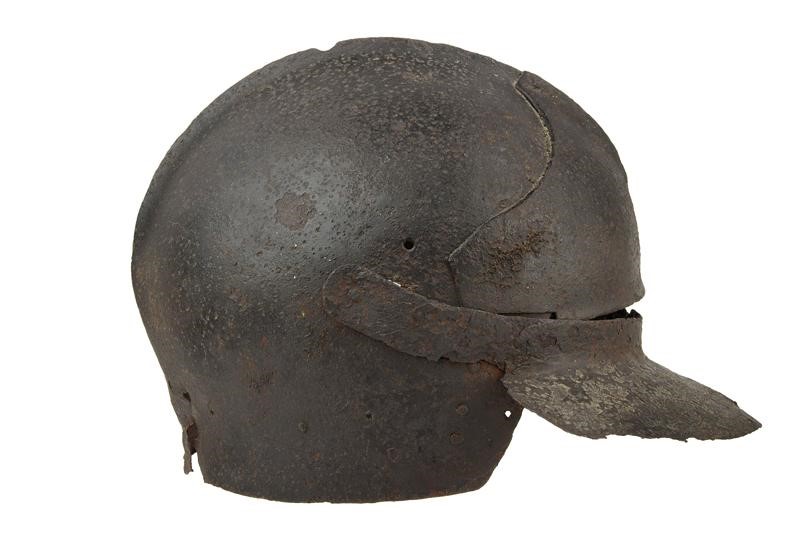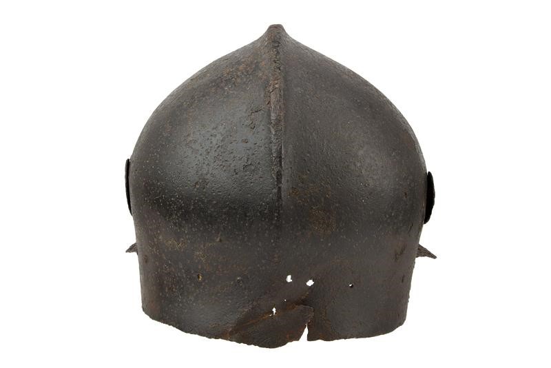 Coppo in ferro lavorato in un solo pezzo con bassa cresta forata alla sommità. La parte frontale con una piastra di rinforzo rivettata, con lievissimi resti di coietti. La tesa rialzabile (forse leggermente più recente, inizio del '500) abbassata sotto al rinforzo (È probabile che abbia ricevuto un colpo dall'alto, e ora forzarla nella posizione corretta potrebbe causarne la rottura.) Alcuni danni sulla nuca e sul lato desto, piccole mancanze.
