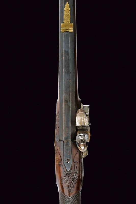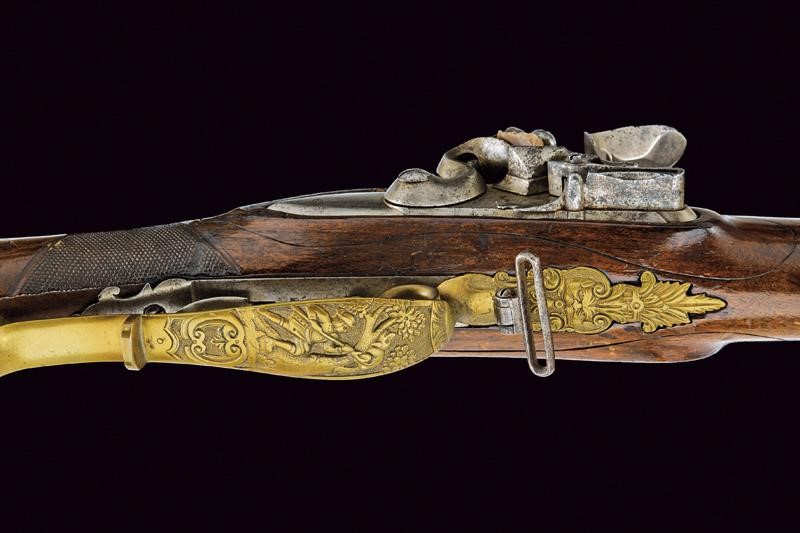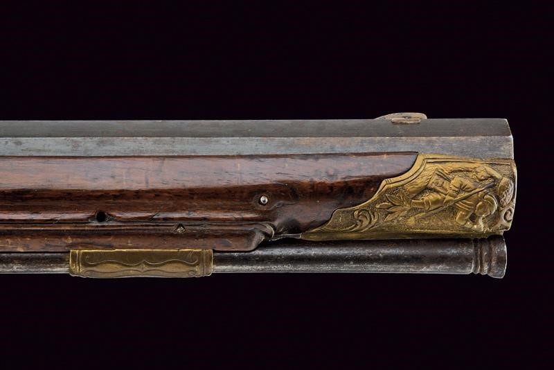 Canna rigata, ottagonale, brunita, con alzo a due foglie parzialmente inciso e dorato, mirino in ottone, volata leggermente strombata, cal. 13 mm. Batteria a pietra focaia, l'arresto da aggiustare, meccanica con sistema antifrizione. Cassa intera in legno scolpito a motivi floreali, il largo poggiaguancia affiancato ad un intaglio di un cervo che si riposa sotto a due alberi; il collo microzigrinato. Bellissimi fornimenti in bronzo finemente incisi con scene di caccia, un guerriero all'antica, trofei e a motivi floreali in bassorilievo. Coperchio del patch-box rivestito d'ottone e recante una bella scena di caccia al cinghiale in bassorilievo. Stecher con azionamento in avanti.