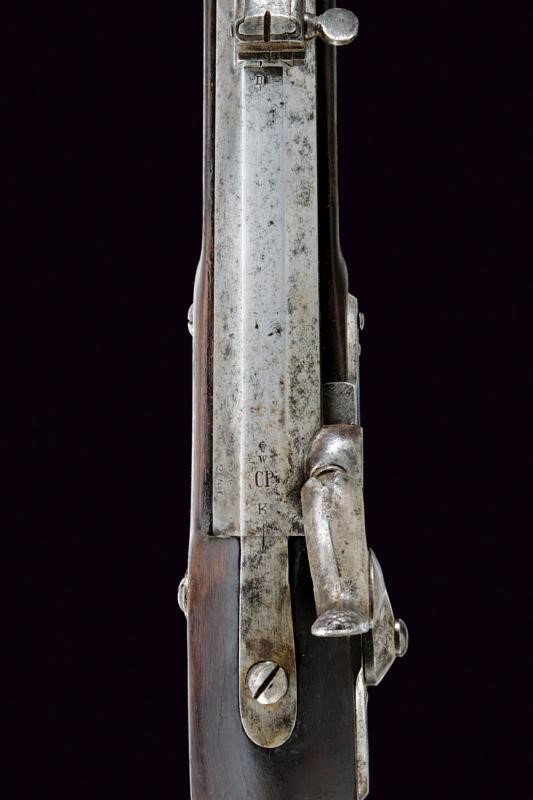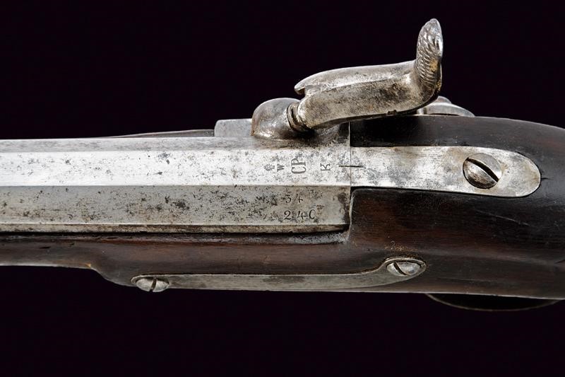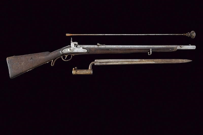 Canna ottagonale rigata (anima pulita, leggero pitting in qualche punto, rigatura visibile) con volata cilindrica, base marcata "CP", "K", "W", "34", "240" e con altre marcature ai lati, dotata di alzo regolabile, mirino e dente di innesto per la baionetta, cal. 13.9 mm. Batteria a luminello a molla in avanti, cartella con data "854" e punzone imperiale. Cassa intera in legno (segni d'uso e del tempo) con fornimenti in ferro in patina, calciolo marcato "V. L. V. D. 3531". Completo della sua baionetta, con marcatura "4 C 6 1", lunghezza: 70,9 [cm]. Con bacchetta in ferro dotata di battipalla e pomo in legno.