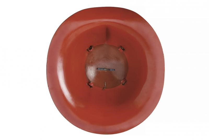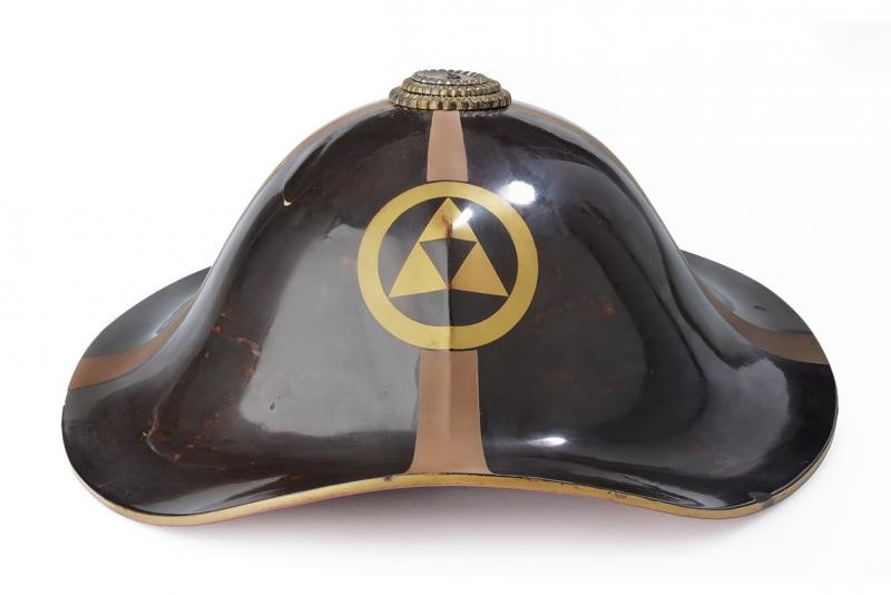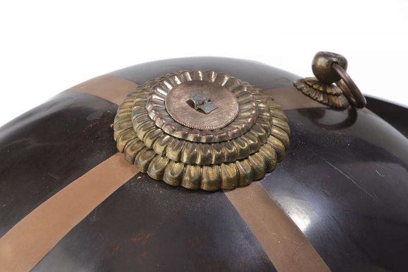 Di forma convessa, in lacca nera, decorato a fasce dorate incrociate al sommo, Mon sempre a lacca oro sopra la tesa rialzata. Completo dei suoi fornimenti in rame. Interno in lacca rossa.