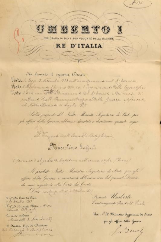 Il copricapo con corpo rivestito in panno nero (buchi da tarme) completo di tutti gli effetti e del numero di reggimento "18". All'interno alluda in pelle e cuffia in seta (segni d'uso). In scatola di legno. Insieme con un paio di spalline da capitano ed il documento di nomina al medesimo grado per il tenente Raffaele Mussolino.