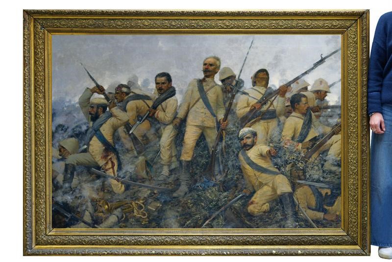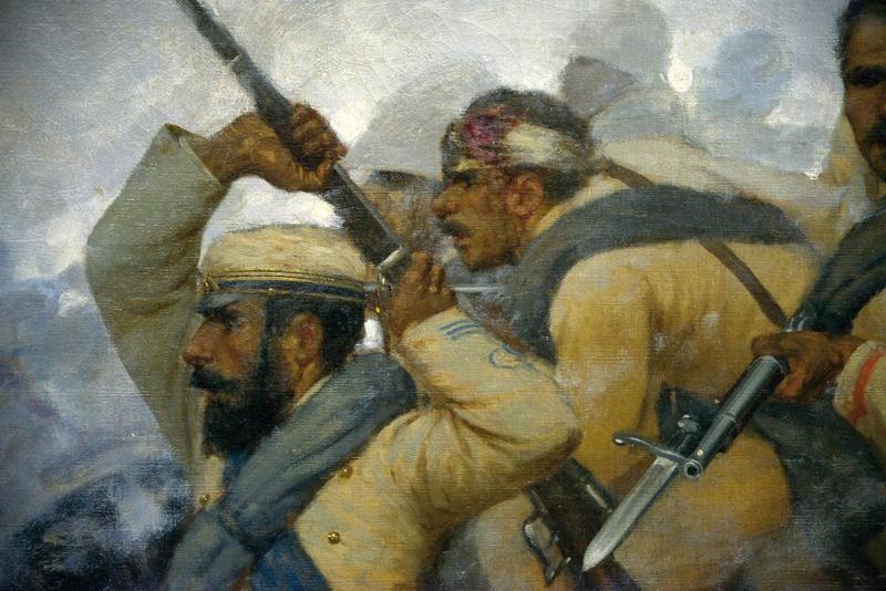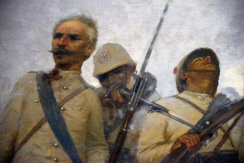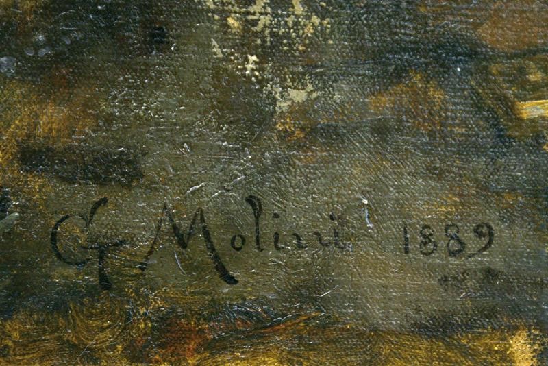 Olio su tela. Maestosa raffigurazione dell'eroica ultima resistenza dei soldati italiani sulla collina nei pressi di Dogali, assaliti da soverchianti truppe nemiche. Al centro è raffigurato il comandante, tenente colonnello Tommaso De Cristoforis, provato dallo scontro ma comunque in posa stoica e spavalda di fronte al nemico, armato della sua sciabola e del fucile Vetterli con baionetta inastata. Attorno i suoi militi, in parte feriti o morenti, ma comunque tutti impegnati in un'ultima strenua difesa. Oltre alla generale plasticità e al bel dinamismo della scena è da notare la meticolosa cura nella raffigurazione delle armi, per le quali l'autore deve aver sicuramente copiato dal vivo degli originali, essedo perfetti sia i fucili Vetterli che le baionette. La tela firmata e datata in basso a sinistra "G. Molini 1889". Nella sua grande cornice antica dorata e riccamente stuccata con cornici floreali (doratura e stucchi con alcune mancanze e segni del tempo).