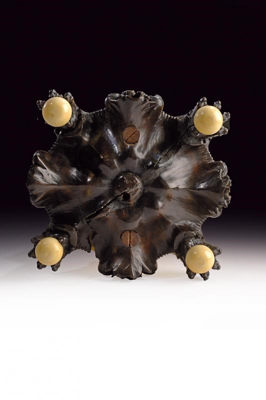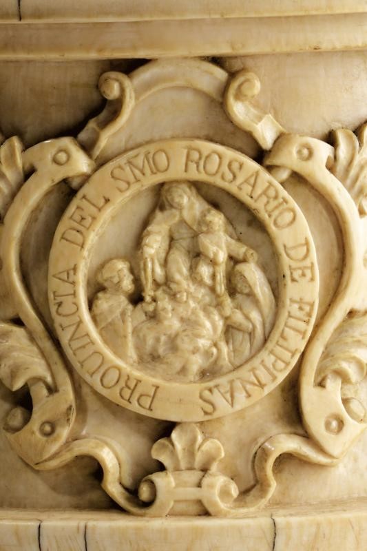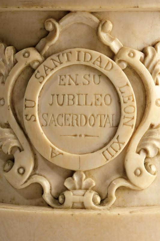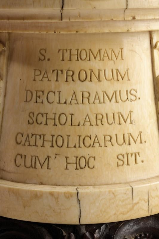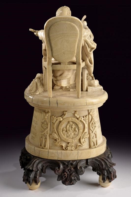 Meraviglioso dono a S.S. Papa Leone XIII (1810-1903) offerto dall'Ordine di Predicatori della Provincia del Santissimo Rosario delle Filippine in occasione del suo giubileo sacerdotale, ovvero il 1887. Straordinario gruppo scultoreo in avorio raffigurante San Tommaso d'Aquino, sacerdote e dottore della Chiesa (1225-1274) seduto su una poltrona, con carta e penna in mano; il suo piede destro posato sulla schiena di una figura prostrata, con la testa di Medusa, che tiene disperata un libro nelle mani. Il tutto posto su un plinto ovale recante iscrizioni ai quattro lati. Su quello anteriore un medaglione con la dedica "A SU SANTIDAD LEON XIII - EN SU JUBILEO SACERDOTAL" (1837-1887). Sul retro un altro medaglione, recante una scena biblica scolpita in bassorilievo, con iscrizione "PROUINCIA DEL SMO ROSARIO DE FILIPINAS", Sul fianco destro l’epigrafe "S. THOMAM PATRONUM DECLARAMUS SCHOLARUM CATHOLICARUM. CUM HOC SIT" (l’iscrizione fa anche riferimento alla lettera breve del 4. Agosto 1880 "CUM HOC SIT" nella quale Tommaso d'Aquino viene nominato patrono delle scuole cattoliche della Sede Apostolica). Su quello sinistro "RATIO AD HUMANUM FASTIGIUM THOM AE PENNIS EVECTA. JAM PERE NEQUIT SUBLIMIUS ASSURGERE. AE TERN. PATR."