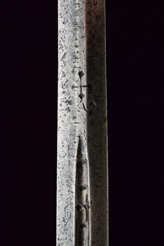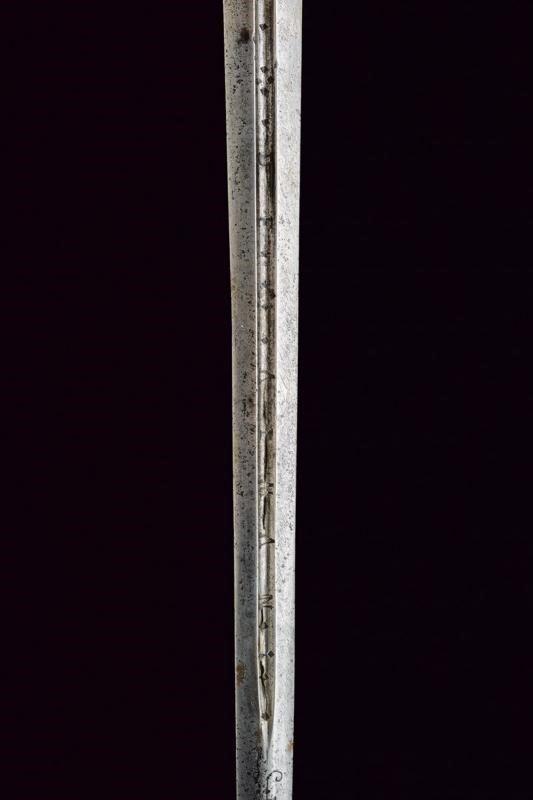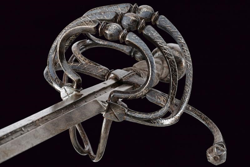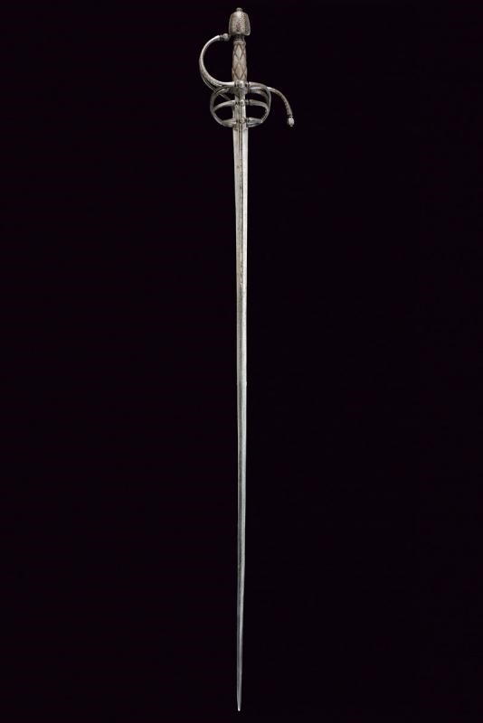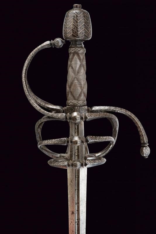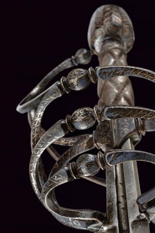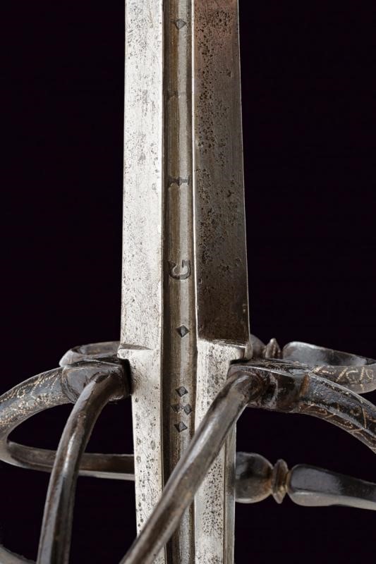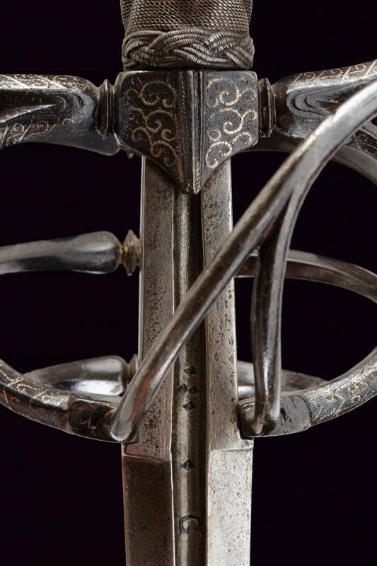 Lunghissima lama dritta a due fili, con profonda scanalatura centrale al forte marcata "GIL DE ALMAN"; ricasso trapezoidale scalato en suite e con due punzoni a stella. Elegantissimo fornimento formato da due ponti e ponticello, due archetti, braccio di parata incurvato verso la lama e guardia a tre rami, massello cuspidato e dotato di sottili nervature longitudinali. I tre ponti, la testa del braccio di parata e della guardia, decorati con nodi ovali faccettati e posti fra due dischi. Pomo faccettato. Tutto il fornimento finemente ageminato con agemine a serie ripetuta di "S" e linee oblique; il pomo decorato con linee a zig-zag. Impugnatura in legno rivestita con trecciola e dotata di teste di moro in filo di ferro; la trecciola lavorata a rombi.