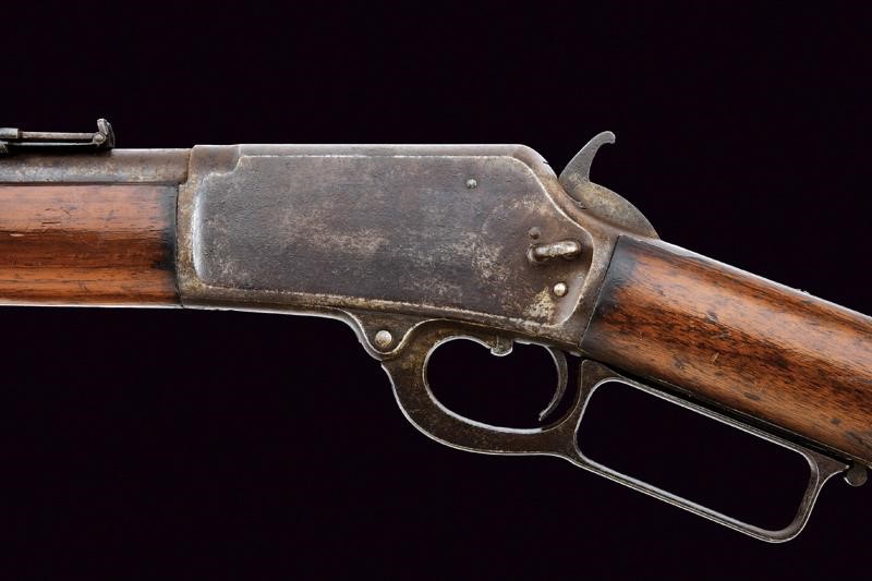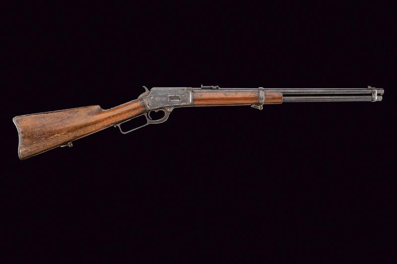 Canna tonda rigata da 20" dotata di mirino, alzo abbattibile e regolabile, marcata con brevetti del 1887 e 1889 e con dicitura del calibro "44W". Anima con incrostazioni da pulire, la rigatura visibile. Castello con marcatura "MARLIN SAFETY" e con occhiello per l'anello da sella (questo mancante). Matr. "37xxx". Calcio ed astina in noce. Fornimenti in ferro. Intaccature alle parti ferrose. Meccanica funzionante (da pulire).