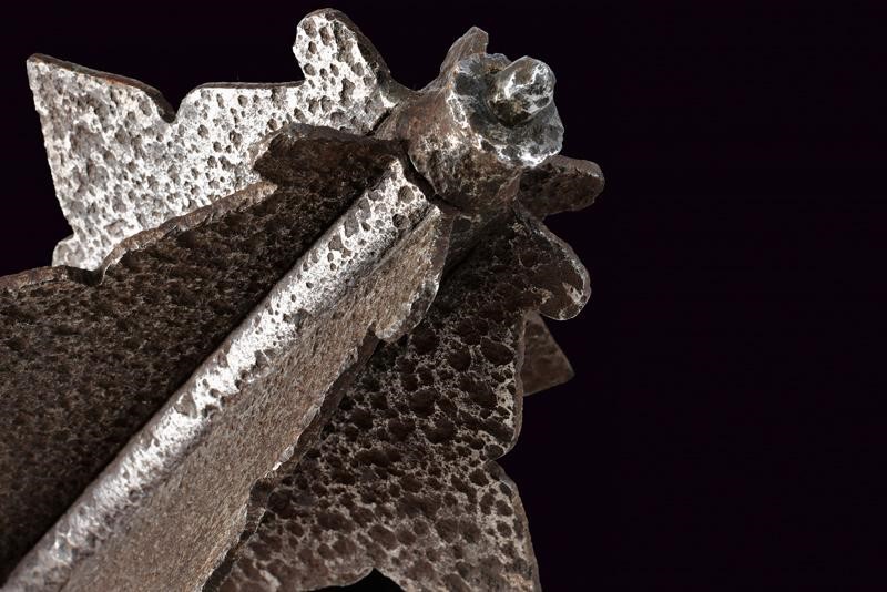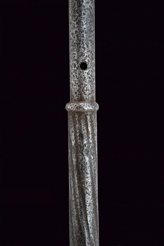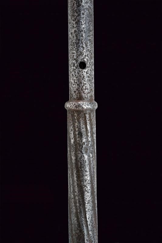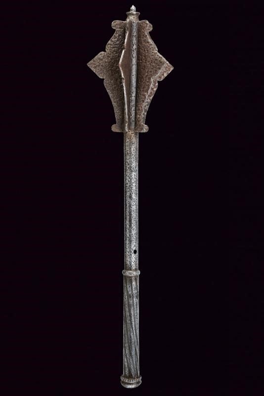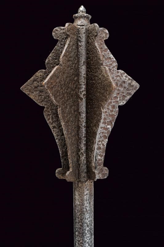 Testa a sei coste appuntite con piccola cuspide. Fusto cilindrico liscio e con foro per la cinghia. Lunga impugnatura ingrossata decorata a spire e a pomo ingrossato ed inciso a stella.