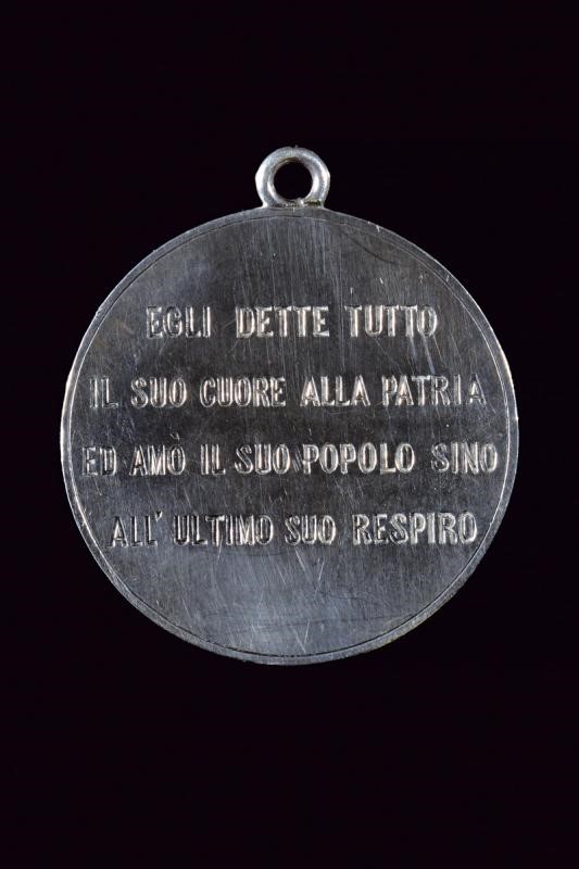 Medaglia in argento recante al dritto bella raffigurazione di Re Umberto I con collare della Santissima Annunziata, al verso con: "EGLI DETTE TUTTO IL SUO CUORE ALLA PATRIA ED AMO' IL SUO POPOLO SINO ALL'ULTIMO SUO RESPIRO". Posta su bella cornice in argento sormontata da corona, e dotata al centro di bottoncino di sostegno per la medaglia; il bordo intrecciato a nodi sabaudi. Interessante.