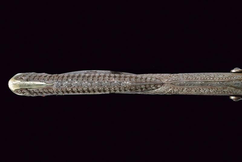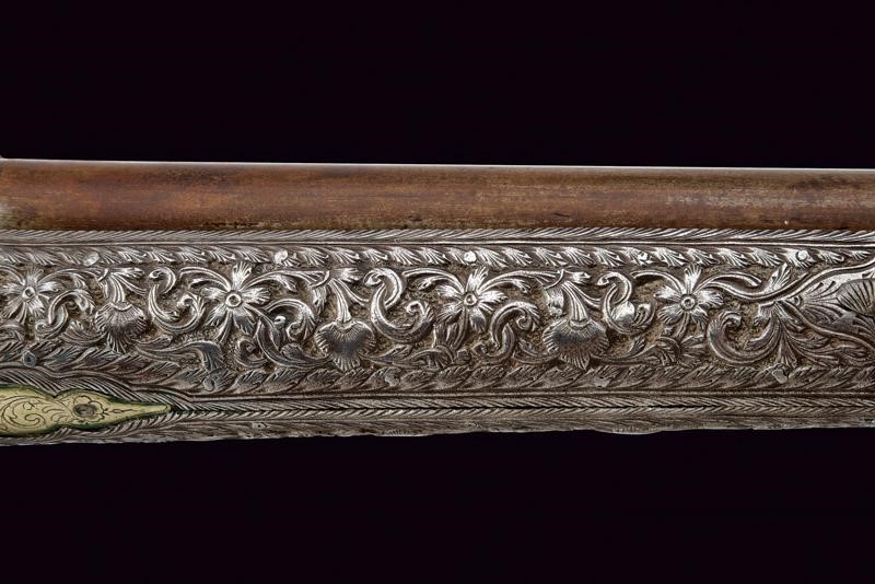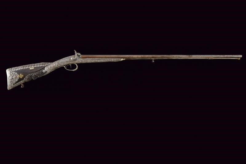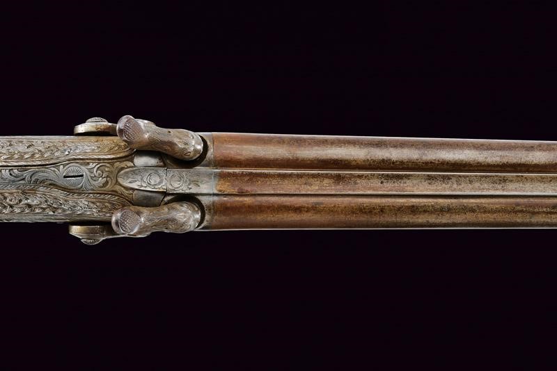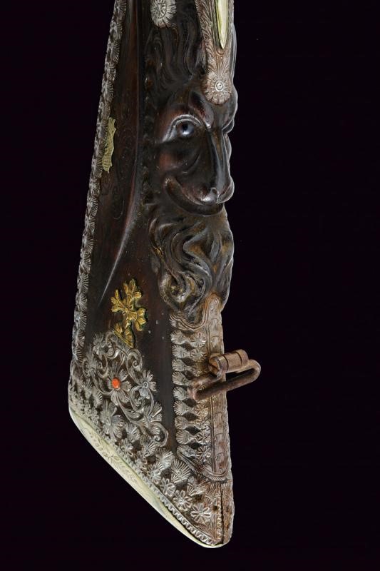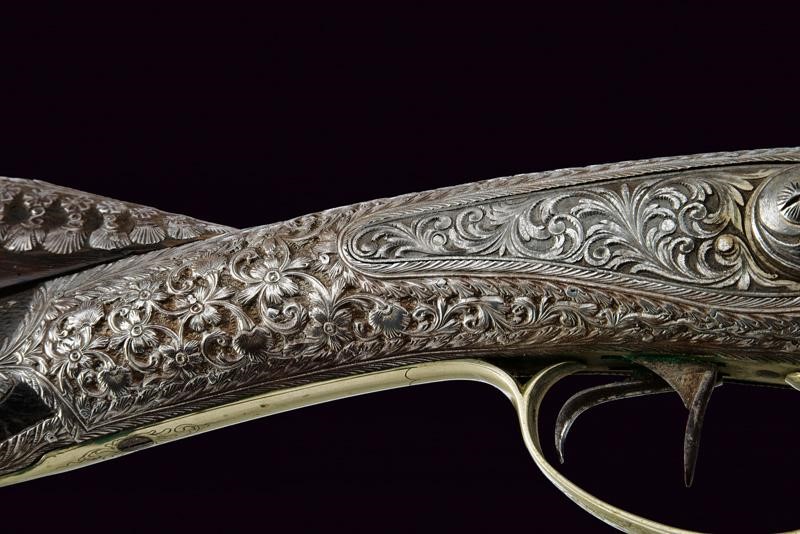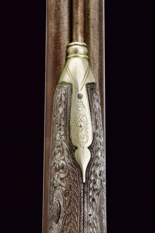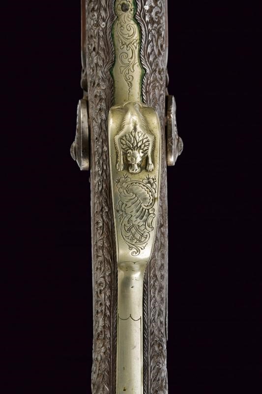 Canne tonde lisce, a torcione, con resti di finitura. Bindella con mirino in ottone. Cal. 14 mm. in volata. Batterie a molla indietro incise e intagliate a racemi. Meccaniche funzionanti. I cani con testa lavorata a segugio e collo ornato en suite con le cartelle. Mezza cassa in legno con bel mascherone barbuto scolpito nella parte inferiore della pala e arricchito con occhi in vetro. Tutto il resto della superficie lignea ricoperto da ricchi fornimenti in ferro tutti intagliati: l'astina con una trama floreale tutta ad intreccio e cornicette a foglie, il collo con la prosecuzione del tema decorativo precedente, con fiori ben rilevati dal fondo. Il dorso della pala con una cornice floreale e a conchiglie, parzialmente traforata. Un grande fregio posto su entrambe le facce della pala sempre lavorato a fiori in rilievo reca al centro una pietra color rosso ed è sormontato da una croce in ottone. Calciolo e ponticello in argentone, il secondo con leone in rilievo che nasce da una foglia. Anche il bocchino in argentone, inciso a racemi come gli altri fornimenti. Sull'unica porzione scoperta di legno, sempre sulla pala, resti di alcune volute incise. Bacchetta in ferro con battipalla in ottone e cavastracci in ferro.