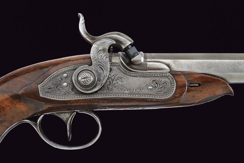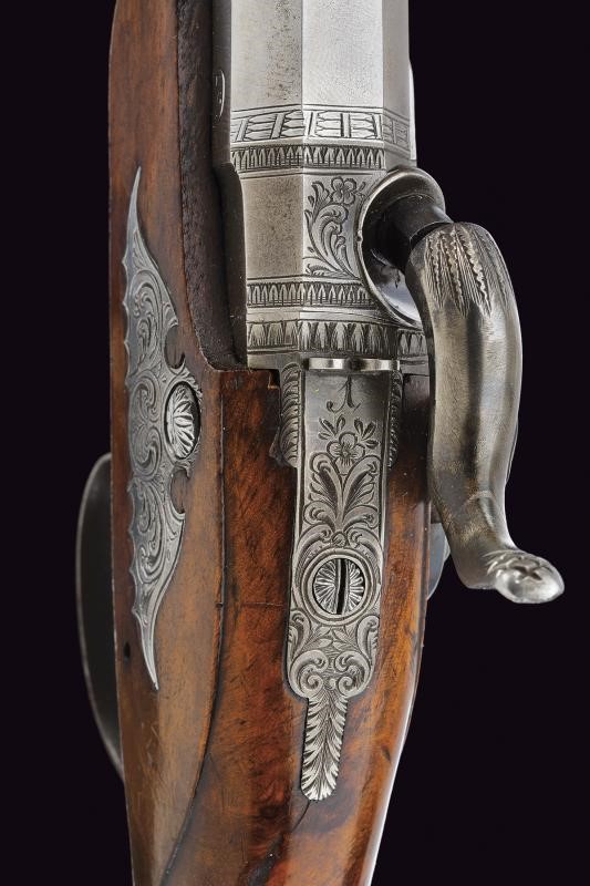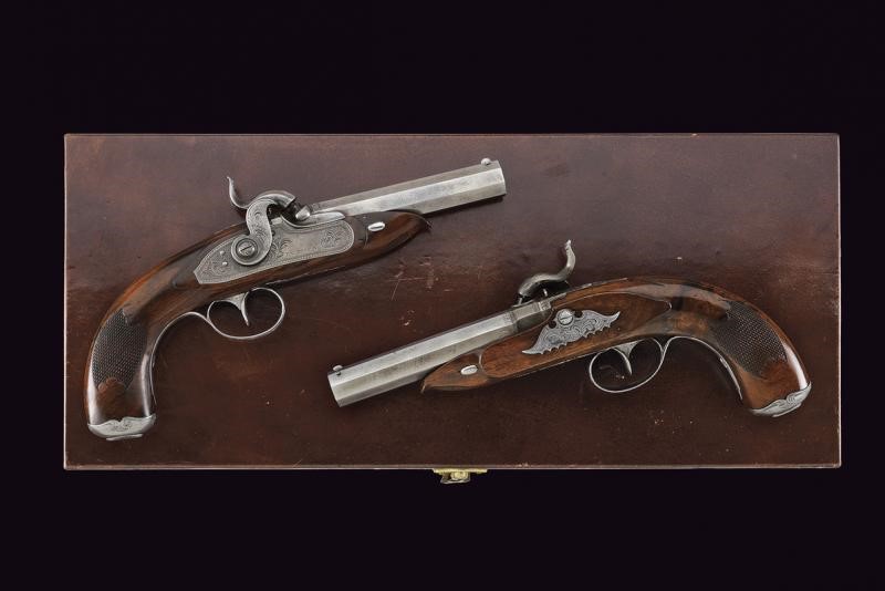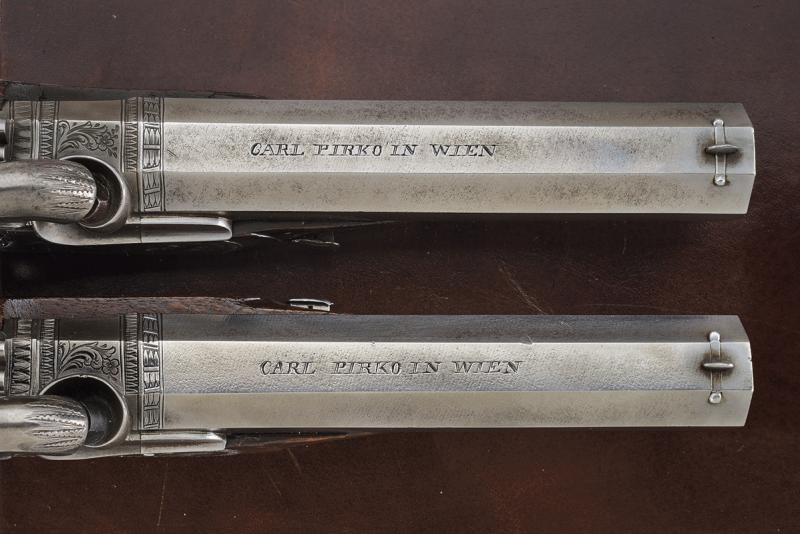 Canne ottagonali, lisce, damascate, firmate "CARL PIRKO IN WIEN", con base incisa a motivi floreali e a bande geometriche; sul lato sinistro punzone del banco di prova di Liegi; mirini di precisione, cal. 12 mm in volata. Codette incise a motivi floreali e munite di alzo. Batterie a molla in avanti marcate "IN WIEN", incise a motivi floreali e con bordo a cornice geometrica, entrambi i cani con restauro. Casse a tre quarti in radica, con muso e calcio zigrinato. Fornimenti in ferro, ponticelli con trofeo, il resto a motivi floreali. Prive di alloggiamento per la bacchetta quindi da cassetta. Conservate in una cassetta non coeva, munita di una fiasca da polvere.