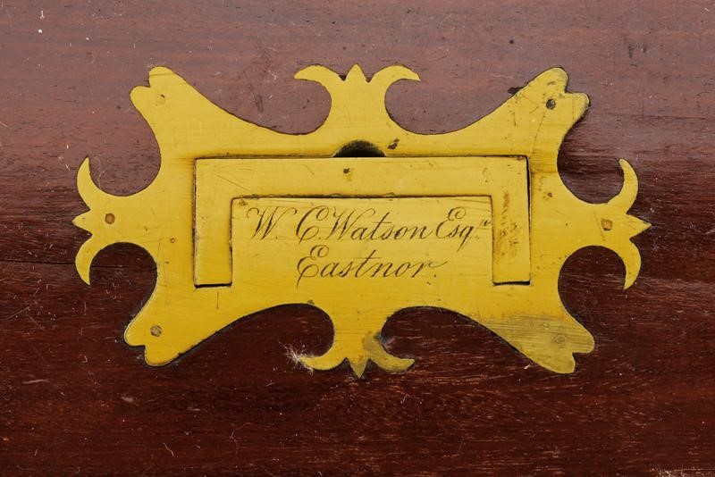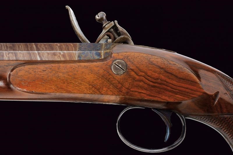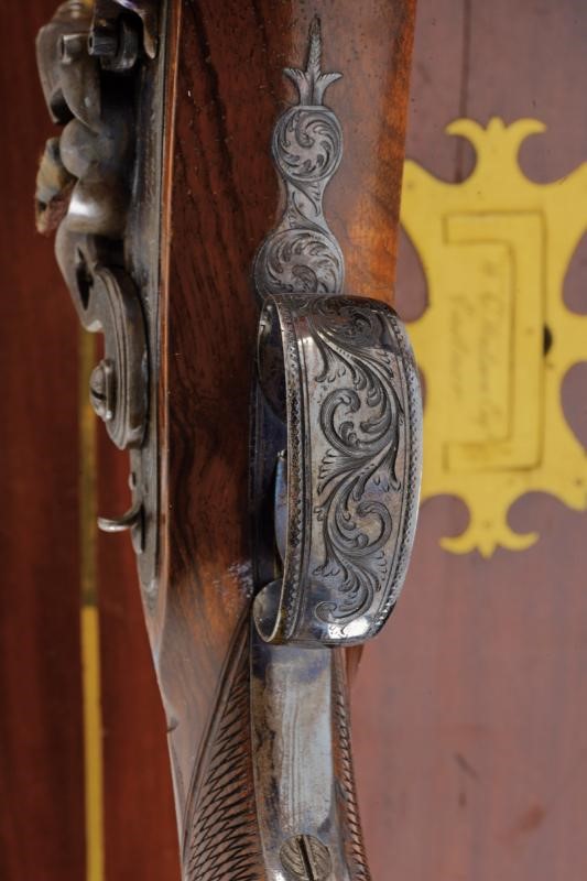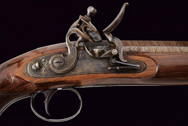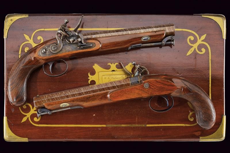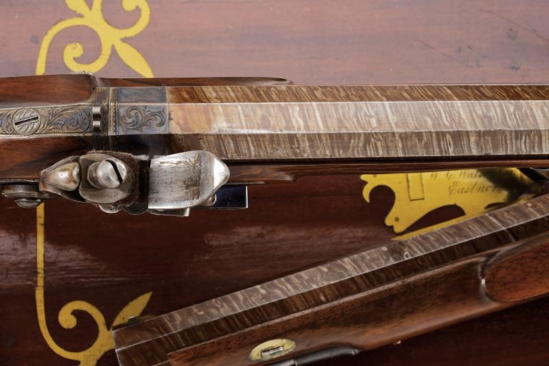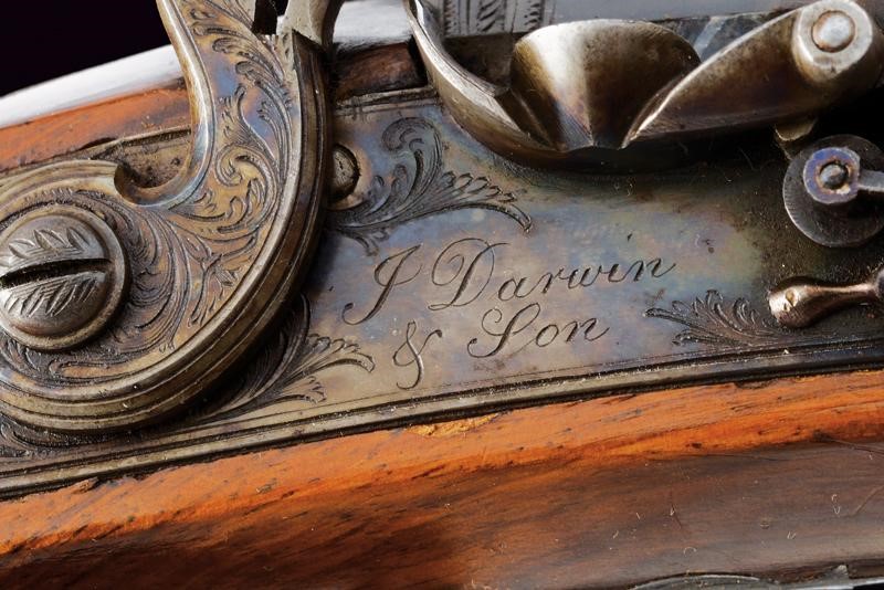 Canne lisce ottagonali, finemente brunite, con culatte decorate a cornici e con disegni floreali, dotate di mirino in volata, cal. 15 mm. Codette incise e dotate di alzo. Batterie firmate "J. Darwin & Sons", con cartelle finemente incise a motivi floreali, brunite, munite di sistema antifrizione, a tenuta stagna e dotate di sicura. Casse intere in legno con calcio zigrinato. Ponticelli bruniti e incisi en suite. Bacchette a snodo in ferro. Nella loro cassetta in legno foderata all'interno di velluto rosso; completa di vari attrezzi e della chiave. Il coperchio decorato con cornice a quattro gigli al cui centro si trova un fornimento marcato "W. C. WATSON ESQ. Eastnor", munito di maniglia a scomparsa.