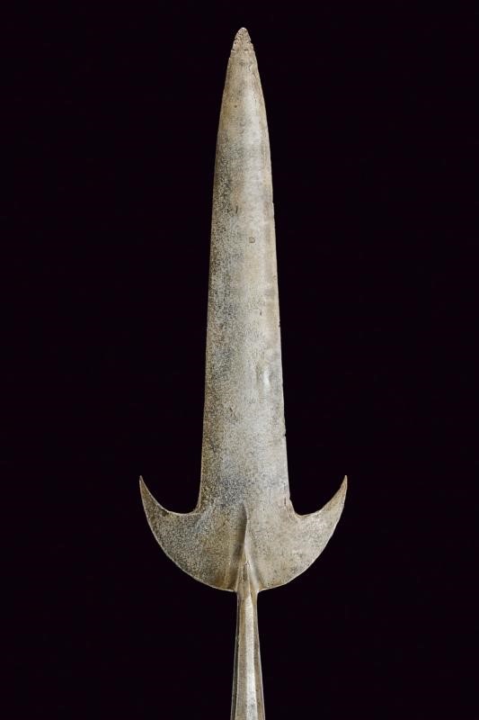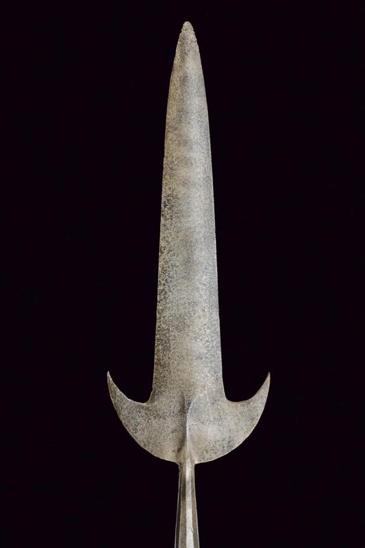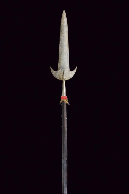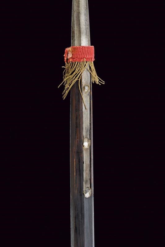 Larga cuspide a due fili, di sezione lenticolare, alla base due ali; zone con danni da ruggine. Gorbia troncoconica faccettata. Bandelle piatte accorciate, su asta lignea di sezione ottagonale, con nappa moderna.