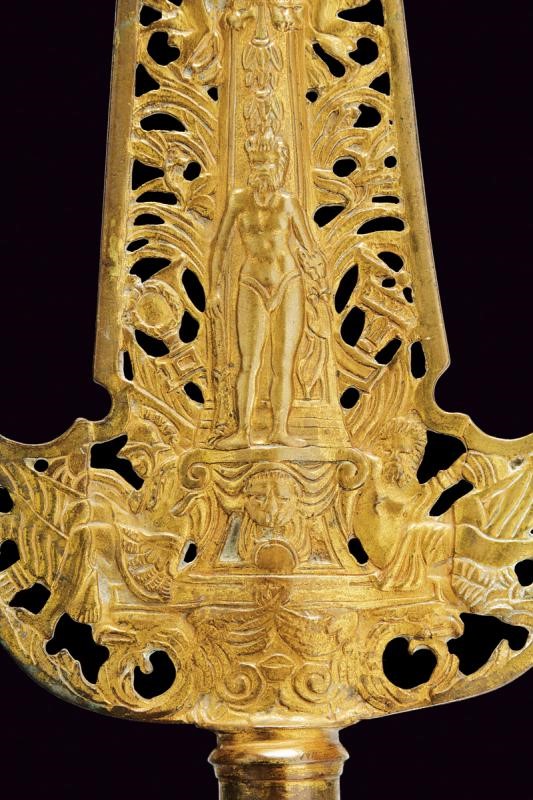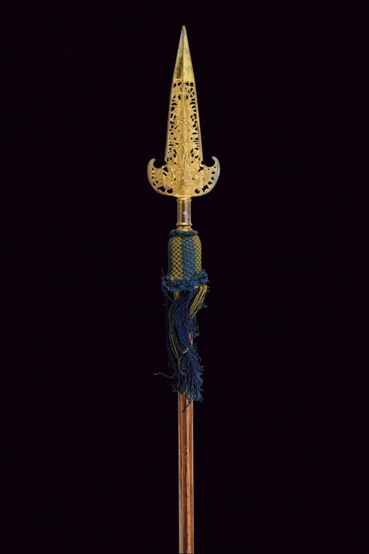 In metallo bianco dorato, inciso e traforato; cuspide a due fili non taglienti costolata alla punta; alla base due larghe ali; al centro effige di una divinità sormontata da una corona di alloro e da una testa di leone, la base con personaggi all'antica, bandiere e strumenti musicali. Gorbia cilindrica con resti di doratura e anellature ingrossate alle estremità. Su asta cilindrica in legno, munita di voluminosa nappa e rivestita con tessuto blu e oro.