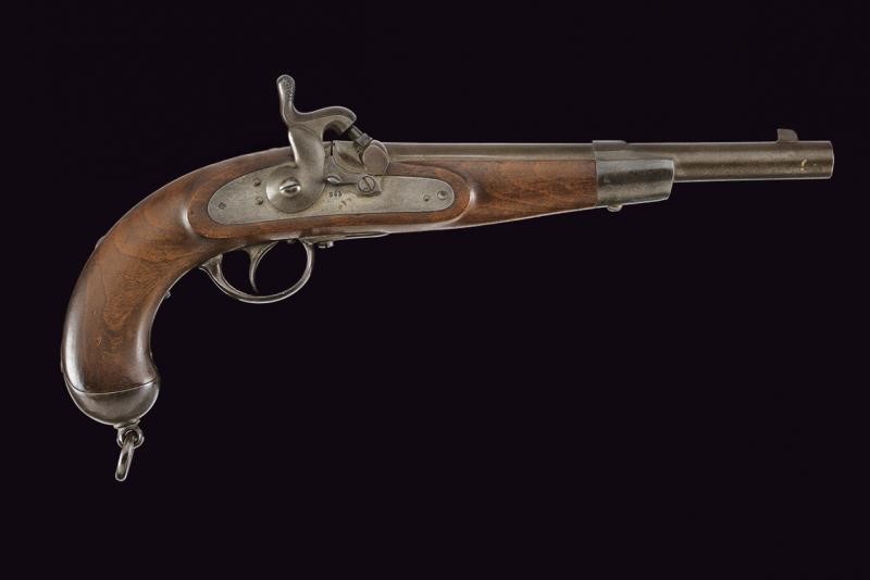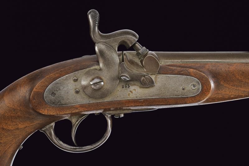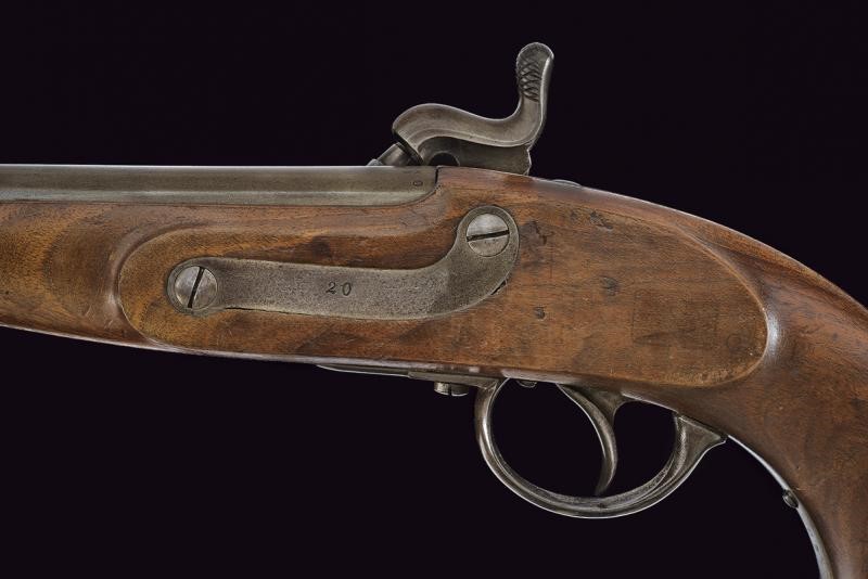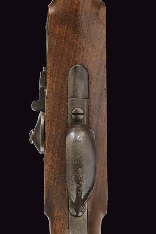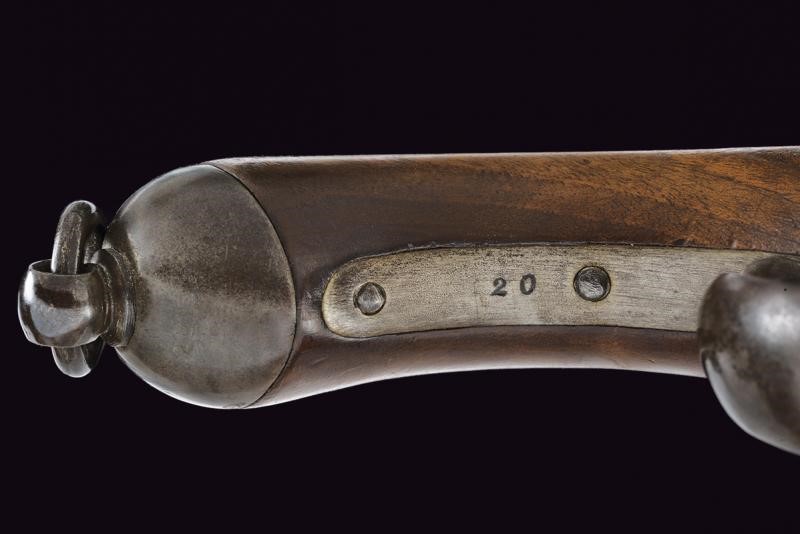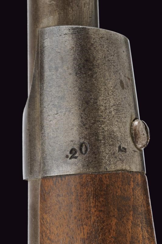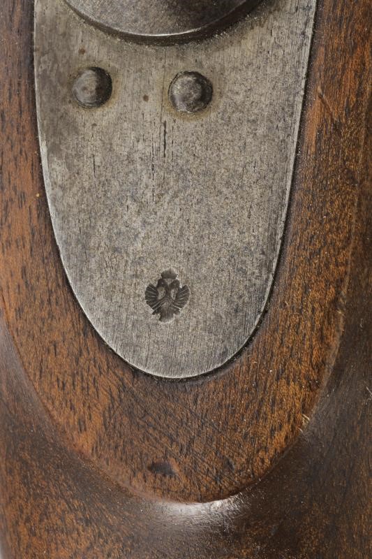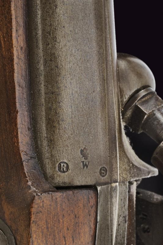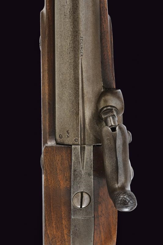 Canna tonda rigata, marcata "ZEILINGER", recante punzoni "R", "S" e "W" sotto aquila imperiale sulla culatta; la base con sottile scanalatura, la volata con mirino alto, cal. 13,9 mm. Batteria a molla in avanti, datata "863" e punzonata con aquila bicipite, munita di sicura; cassa a tre quarti in legno, con fornimenti in acciaio, punzoni "20". Anello di sospensione.