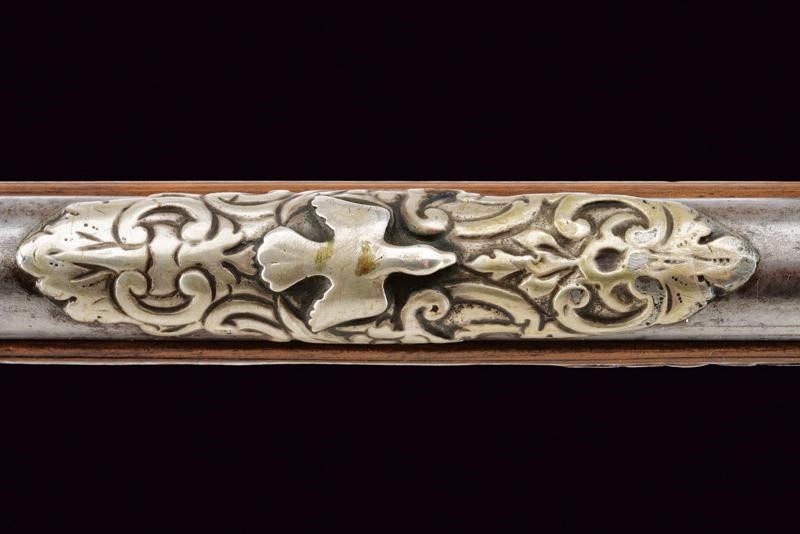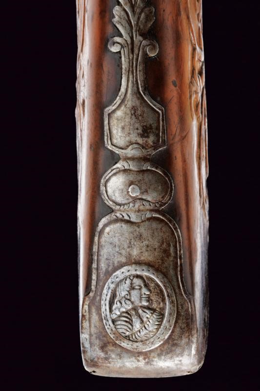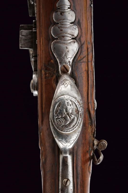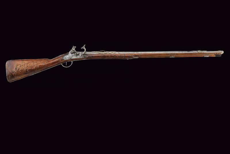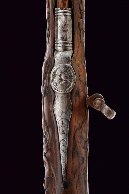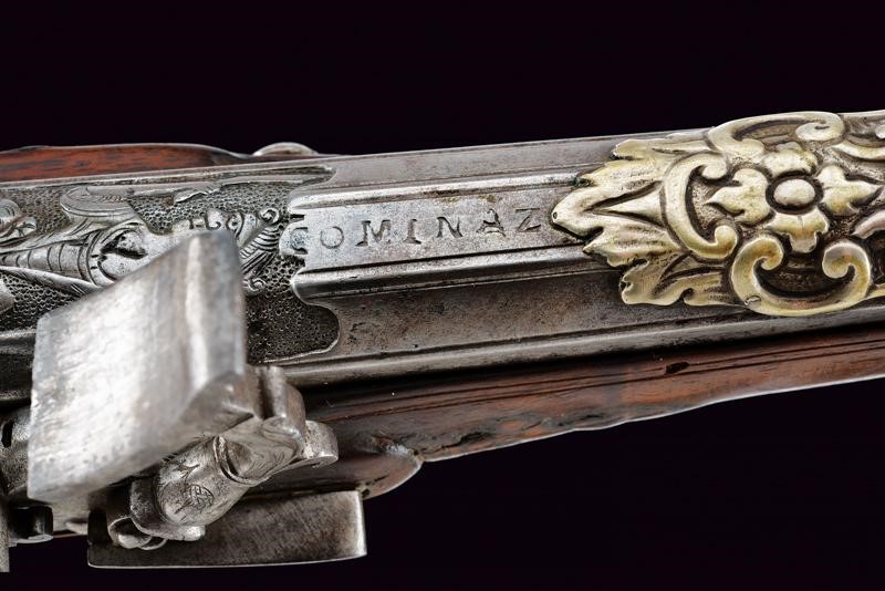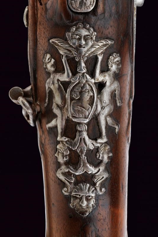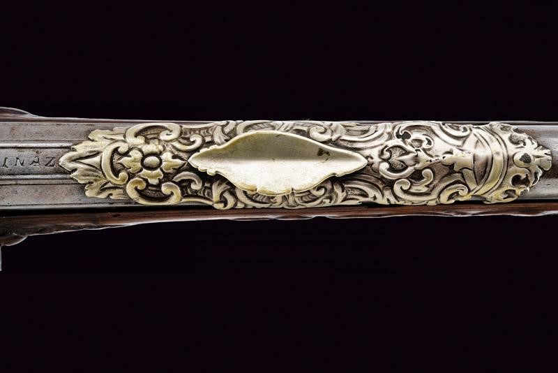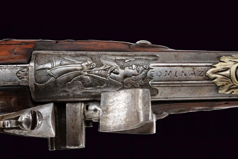 Bella canna riccamente decorata, a tre ordini: ottagonale, faccetta e tonda, con anellature al secondo cambio. In culatta un intaglio effigiante una dama su fondo a granuli, subito seguita dall'iscrizione "COMINAZ", al cambio incisioni a foglie e un profilo. Sulla canna tre bei fornimenti lavorati in metallo color argento: il primo, ovvero l'alzo con ampia base ornata a rocaille e sormontata da corona, il secondo il mirino, realizzato a colomba in altorilievo e con una base en suite, il terzo borda la volata, tipo gioia di bocca, a decoro floreale. Cal. 15,8 mm. Batteria a pietra con cartella piatta incisa a fiorami, come anche il cane, questo anche con testa di lupo, incisa e sagomata anche la martellina. Meccanica funzionante. Marcatura del maestro "GBC". Cassa in legno riccamente intagliata (fori di tarlo restaurati). Bele trame di racemi che mutano in animali o personaggi grotteschi, sia sull'astina che sulla pala, altri piccoli fregi intagliati in vari punti. Fornimenti in ferro. Ponticello con profilo di un nobiluomo in rilievo, come anche il dorso del calcio e la contropiastra, questa anche con trafori a grottesche. Lo scudetto dorsale di bellissima fattura, con putti che reggono un ritratto femminile, e il tutto sormontato da testa di putto alato. Bacchetta in legno con battipalla in corno.