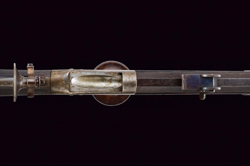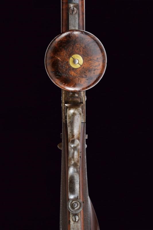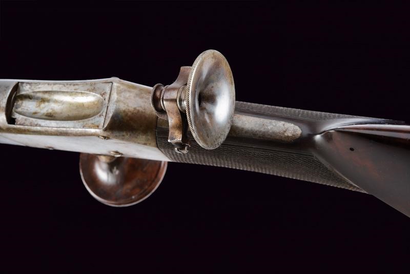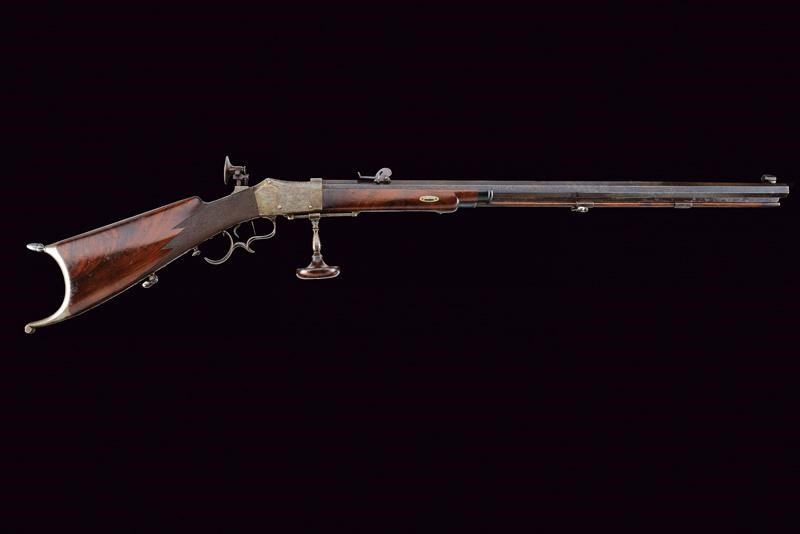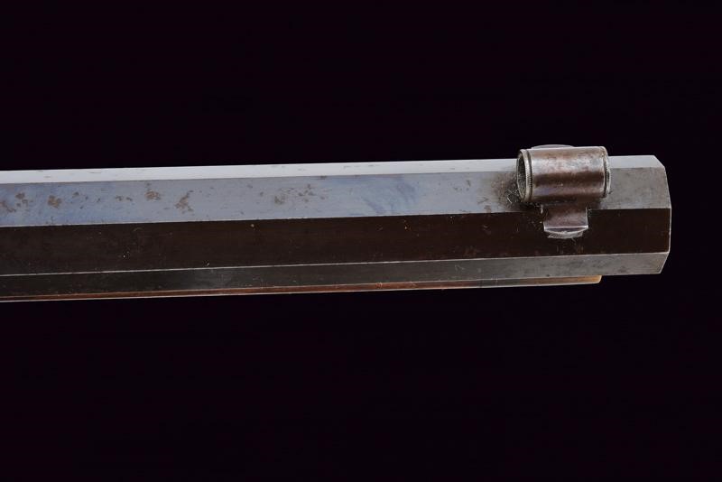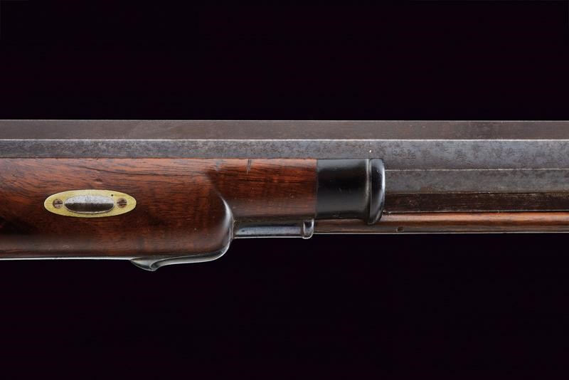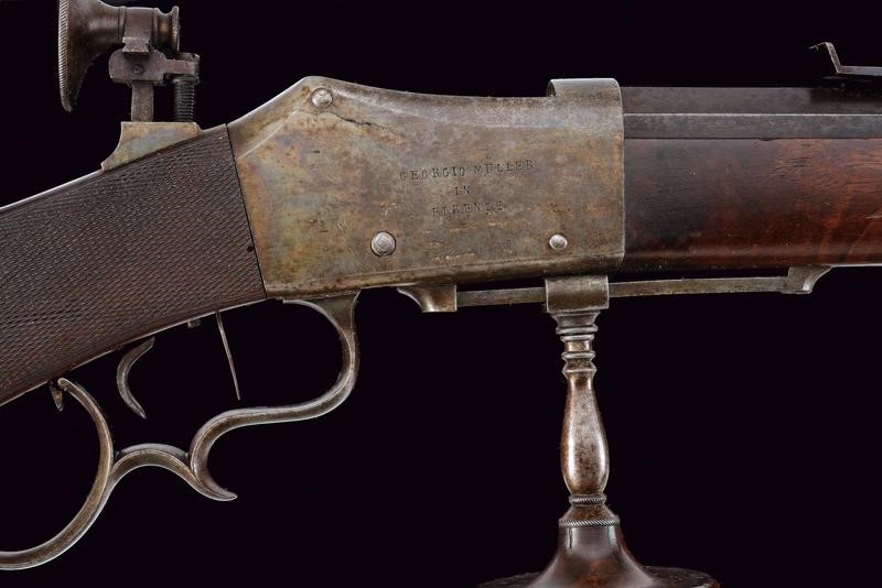 Pesante canna ottagonale, brunita, rigata (anima pulita, con leggero pitting in volata, rigatura ben visibile), munita di alzo regolabile e mirino di precisione, cal. 9 mm. Otturatore con sistema Martini, meccanica da rivedere. Castello in ferro firmato sul lato destro "GEORGIO MŪLLER IN FIRENZE". Calcio ed astina in legno con collo microzigrinato, muso in corno. Codetta con diottra. Nella parte inferiore guida in ferro con pomo scorrevole in legno e ferro. Calciolo del tipo cantonale modello 1851. Stecher. Ponticello con poggiadito. Bacchetta in legno con battipalla in corno e cavastracci in ferro.