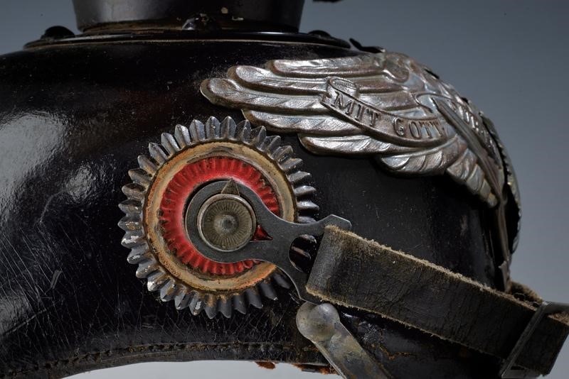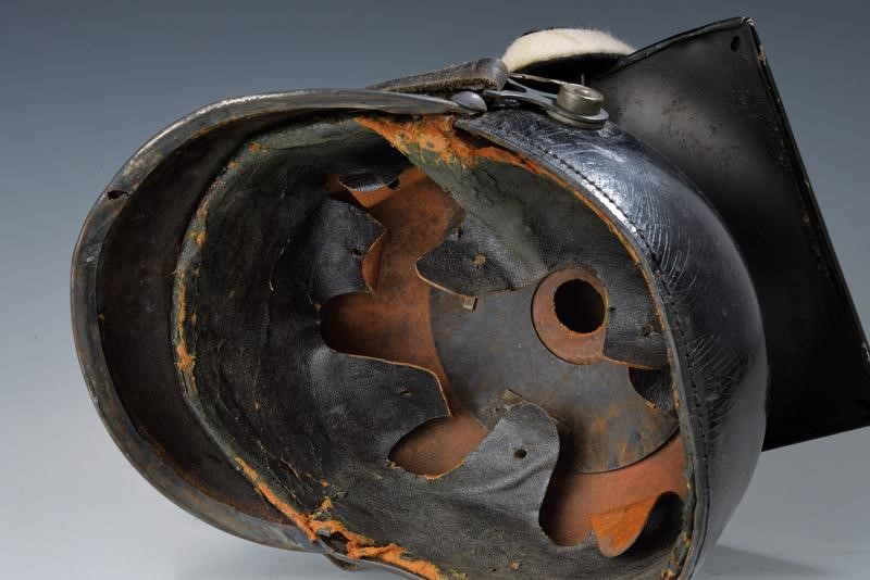 Coppo e visiera in cuoio, la visiera anche con bordo in ferro; la parte superiore in lamina di ferro dipinta di nero; sulla frontale aquila con stella dell'ordine dell'Aquila Nera color grigio, soggoli in cuoio. Coccarda del reich e feldzeichen prussiano. Alluda in pelle.