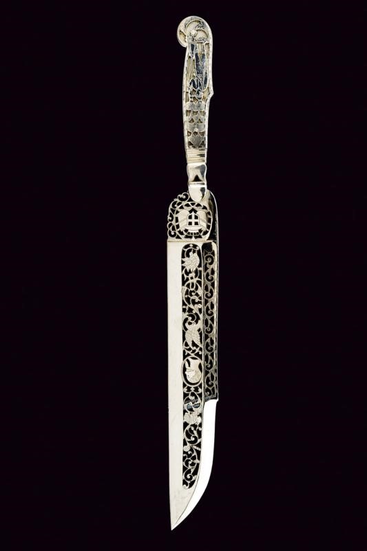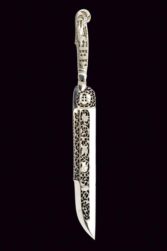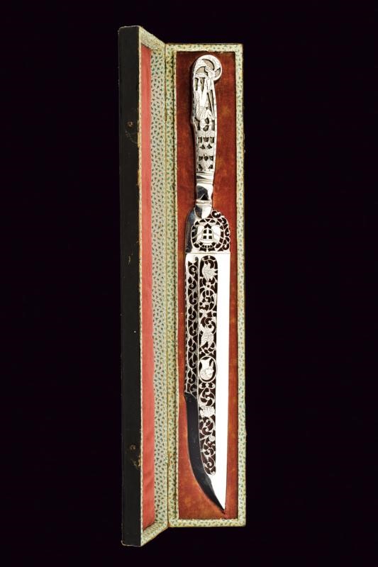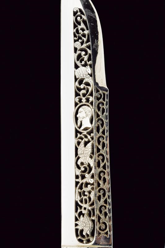 Lama dritta a un filo e breve controfilo; più di metà della superficie della lama è finemente traforata ed incisa a volatili, motivi floreali e con volto del Re entro cornice ovale. Anche il tallone e messo a giorno con scudo sabaudo coronato. Collo faccettato e con traforo triangolare. Impugnatura in acciaio lavorata en suite con la lama e raffigurante un cacciatore fra gli alberi, armato di fucile. In cassetta originale di legno ricoperta di sottile cuoio, con coperchio recante francobollo numerato "156" e con firma in oro "MICHELANGELO GRAVINA IN CAMPOBASSO"; l'interno rivestito in velluto color cremisi (zone lise e piccolissime mancanze). Di alta qualità.
