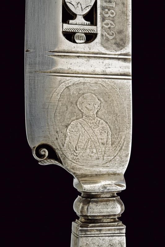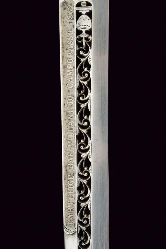 Lama dritta a un filo e breve controfilo, la parte centrale con banda traforata ed incisa a racemi e con vaso; sotto al dorso, in alto, la firma "LARTEFICE RAF. VILLANI DI CAMPOBASSO 1862". Tallone con raffigurazione di Vittorio Emanuele II su un lato, l'altro lato liscio. Il collo lavorato a colonna faccettata. Impugnatura in acciaio in un unico pezzo, anch'essa messa giorno essendo magistralmente traforata ed incisa a trofei, scudo sabaudo e motivi floreali; la superficie esterna impreziosita da piccole bande in ottone lavorate a tacche. Di buona qualità.