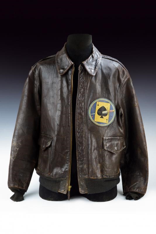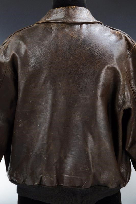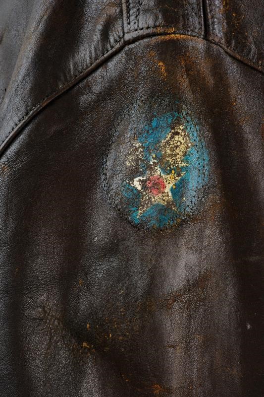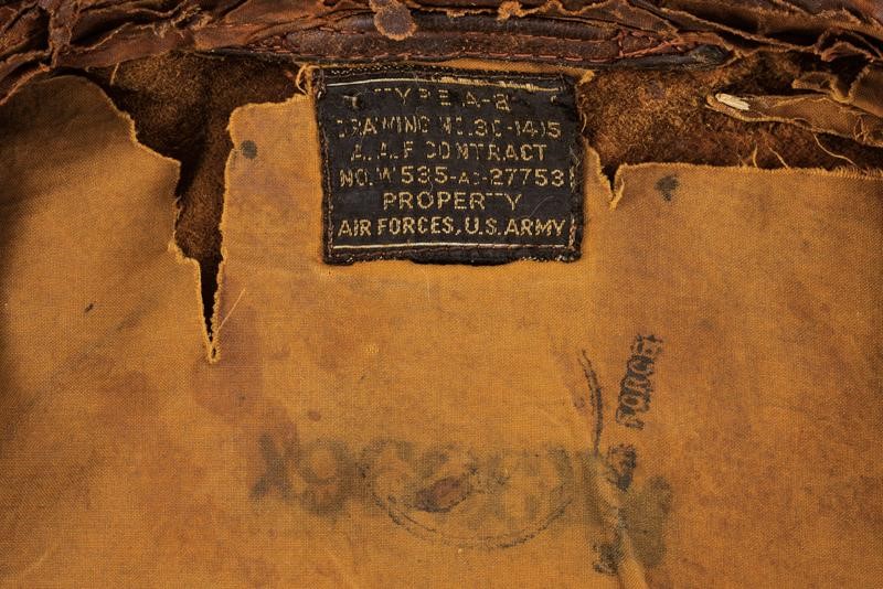 In pelle marrone ben conservata ma con evidenti segni d'uso e del tempo. Recante resti dello stemma della Army Air Force dipinto sulla spalla sinistra. Sul petto bellissimo patch in pelle del 116° Squadrone Osservazione (116th Observation Squadron), effigiante l'asso di picche trafitto da un pugnale. Il liner originale, in condizioni mediocri con rotture e distacchi, recante vari marchi di accettazione della Air Force; inoltre, trascritto a mano, un nome e numero di matricola. Presente l'etichetta di produzione con numero di contratto riferibile al 29 Aprile 1942, con ordine assegnato alla The Cable Raincoat Co. per la produzione di 50000 unità. Cerniera originale ancora funzionante. Epoca: Seconda Guerra Mondiale