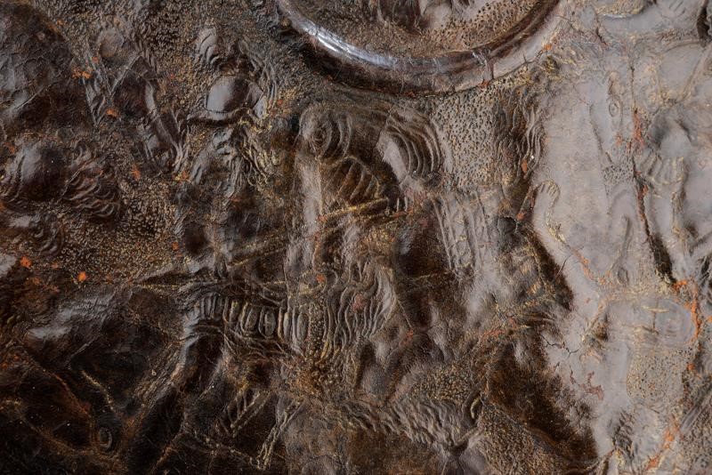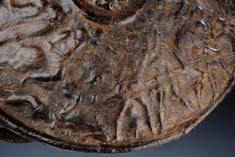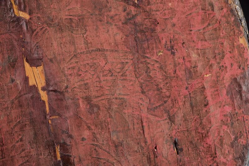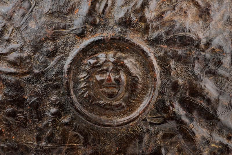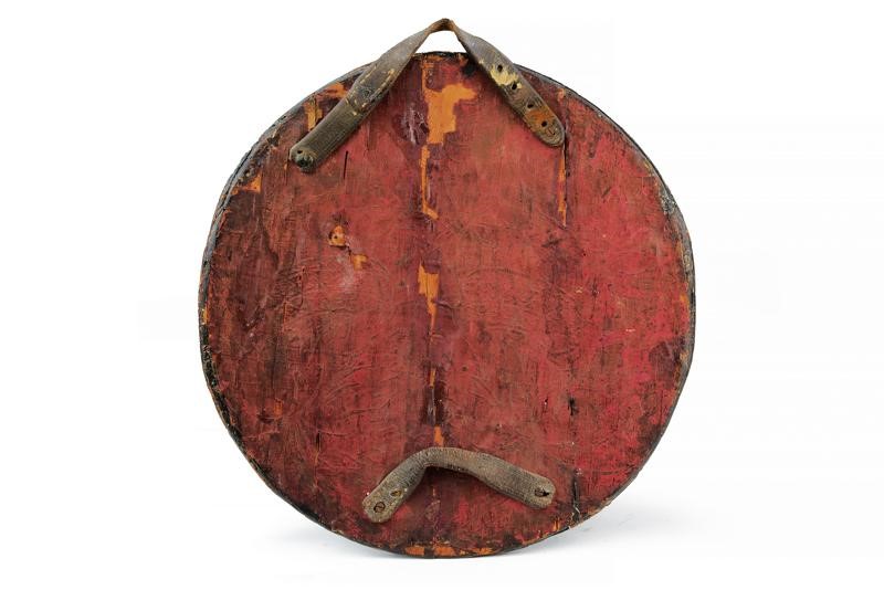 Di forma circolare, leggermente convessa. La struttura in legno, rivestita di cuoio bollito ed inciso, foderato di gesso. La superficie anteriore con al centro un medaglione recate la testa di Medusa, attorno a questa effigiata una battaglia fra guerrieri all'antica a cavallo e a piedi, il tutto in rilievo. Il retro ricoperto con broccato rosso (mancanze) con resti di fini ricami in canutiglia. Due maniglie in cuoio, antiche ma di epoca successiva.