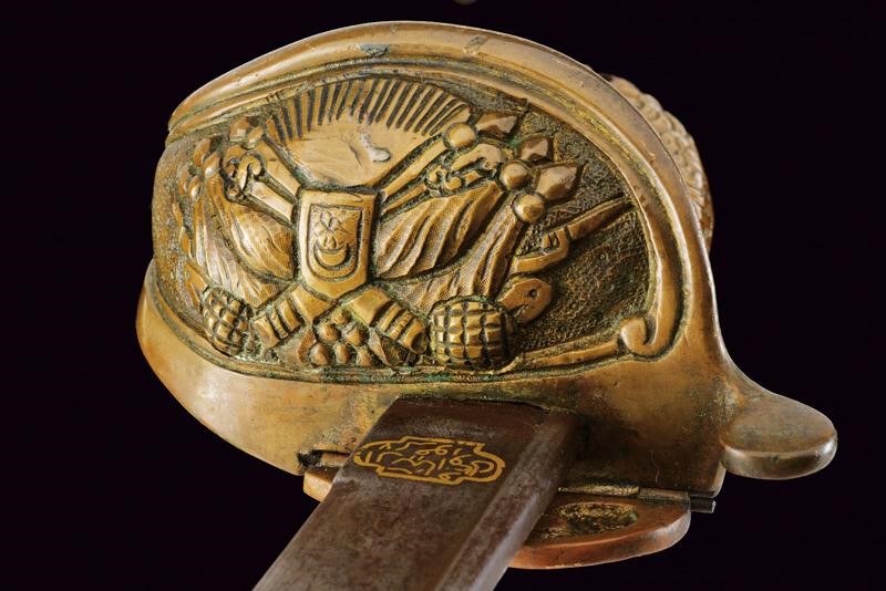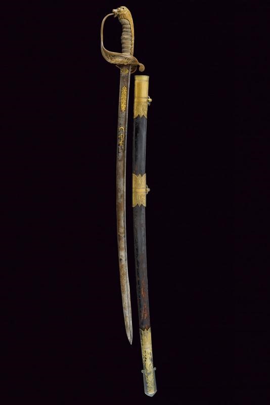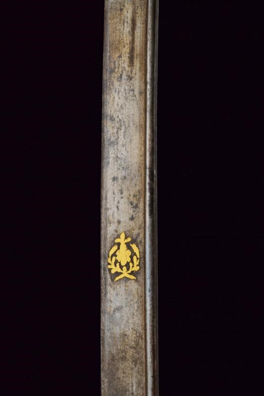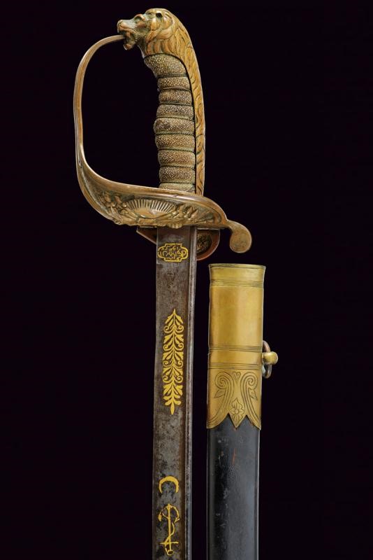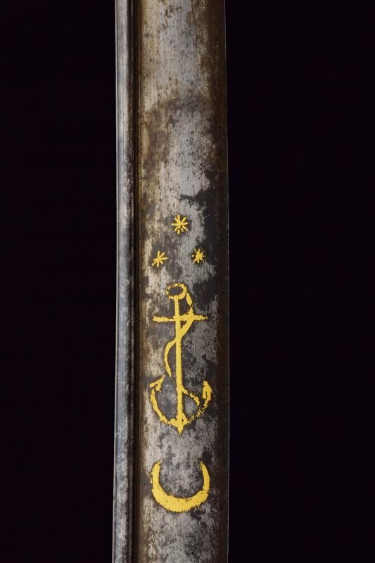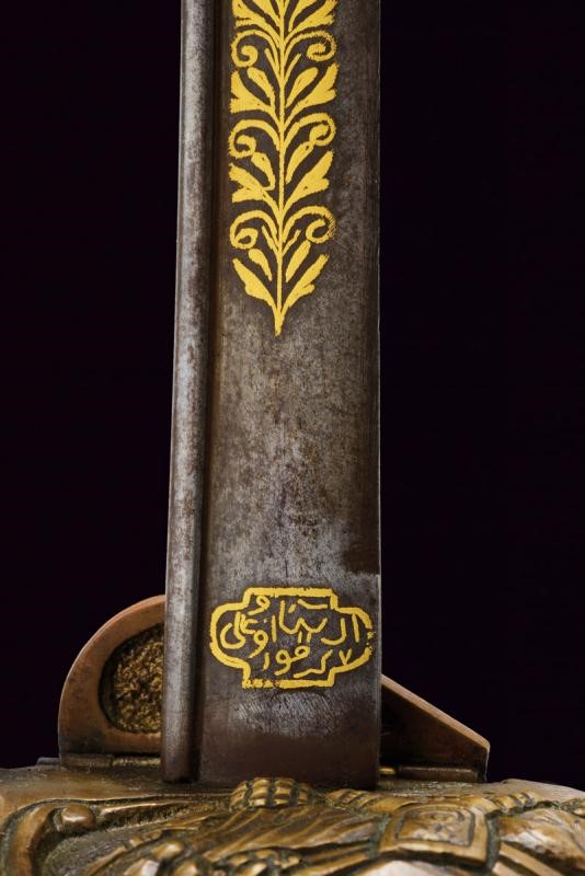 Lama leggermente curva con jelman, recante alla base un cartiglio con iscrizioni in arabo rimesse in oro, decorazioni ed un'ancora fra stelle e luna. Sul lato opposto decorazione sempre in oro. Fornimento in bronzo con trofeo sulla valva, pomo a testa di leone con cappetta lunga, impugnatura in legno rivestita di pelle di pesce e con trecciola metallica. Fodero in cuoio con fornimenti in ottone inciso, vela in ferro e due anelli di sospensione.
