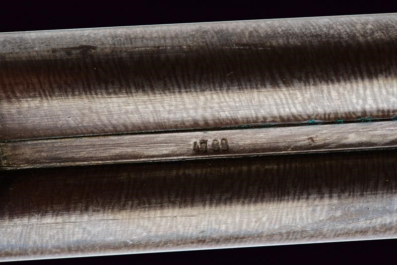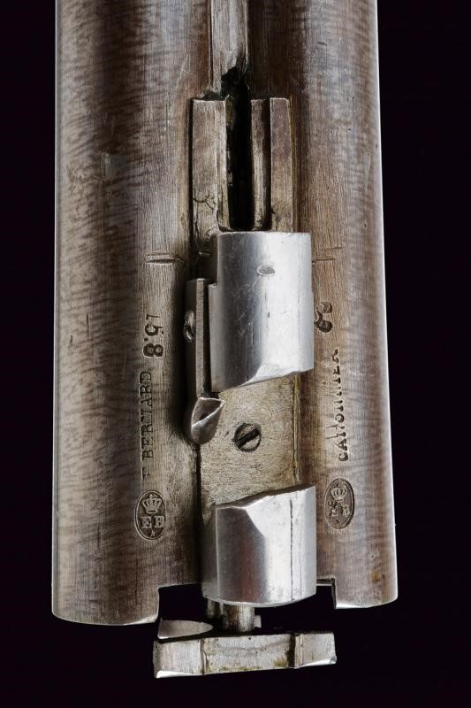 Gruppo di tre canne tonde, lisce (con leggero pitting), in damasco, brunite, quella superiore dotata di bindella avente la prima parte allargata e leggermente convessa, questa reca l'iscrizione "LAINE' INVENTOIR BREVETE' RUE DE RIVOLI 21 PARIS". Il mirino in ottone, cal. 16 mm in volata (inferiore a 16 gauge); codetta incisa. Batterie a molla indietro con incisione ai bordi; due cani laterali e uno centrale. Chiave con leva d'apertura davanti al ponticello. Calcio ed astina in legno liscio. Fornimenti in acciaio decorati en suite. Il grilletto anteriore aziona in sequenza i cani laterali, quello posteriore aziona il piccolo cane della canna superiore.