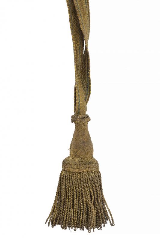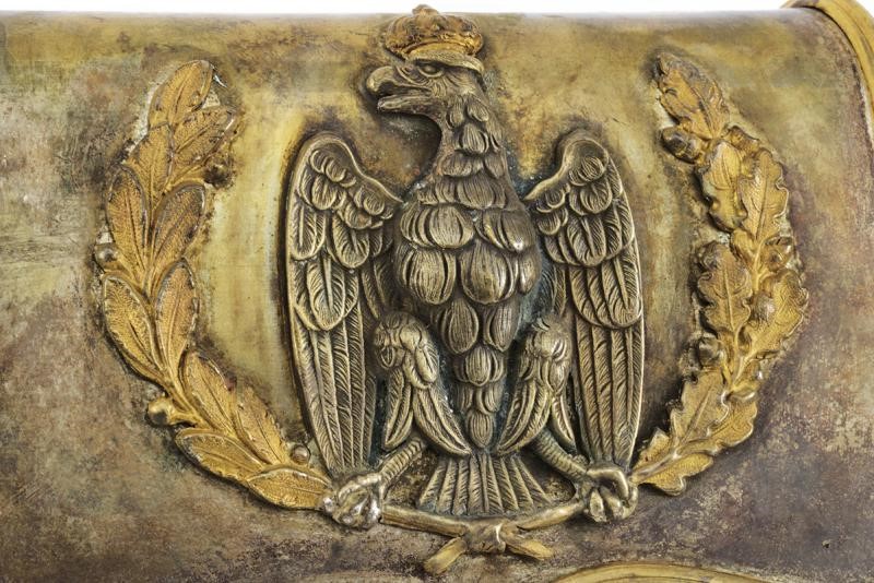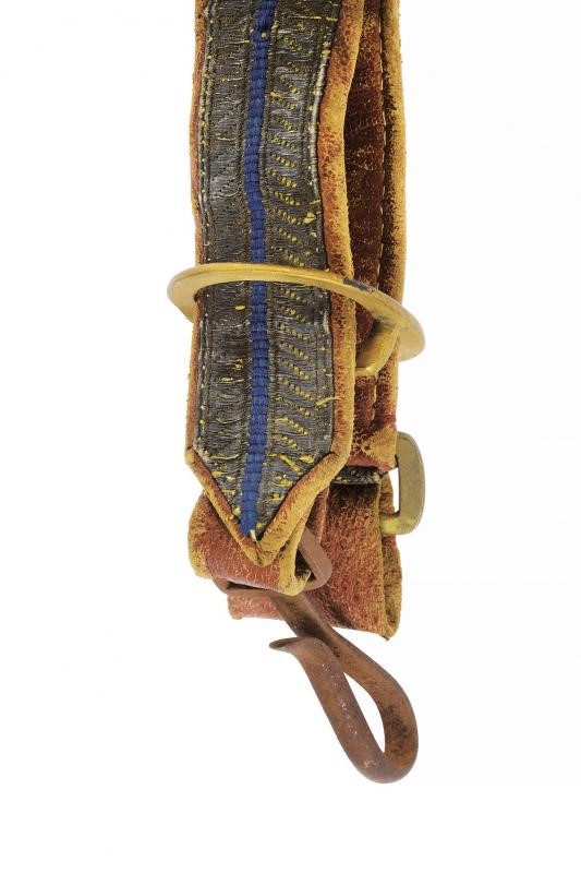 Giberna in legno rivestito di cuoio, con coperchio in lamina d'argento munita di aquila tra fronde di quercia e lauro, i lati fianchi in argento sbalzato a trofei; completa di bandoliera con gallone in canutiglia e banda centrale azzurra, recante bellissimi fornimenti in argento e fodera in velluto bordeaux. La cintura in canutiglia con tre fasce blu e con fibbia caricata dall'aquila estense in argento su fondo dorato; completa degli attacchi per la sciabola. Infine la dragona in canutiglia (brunita e con strappo) con due bande blu.