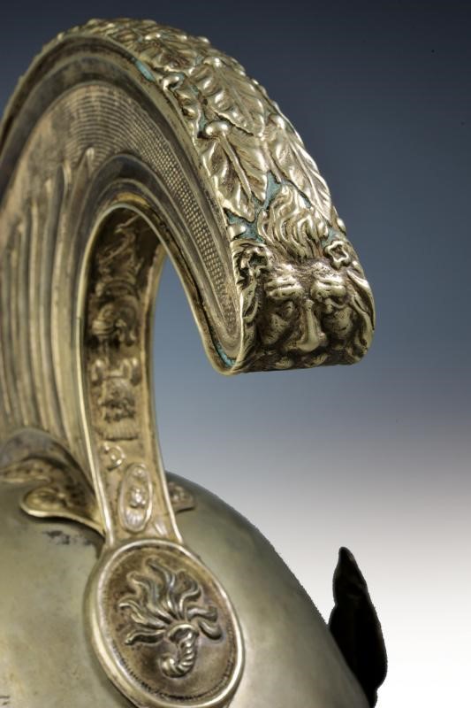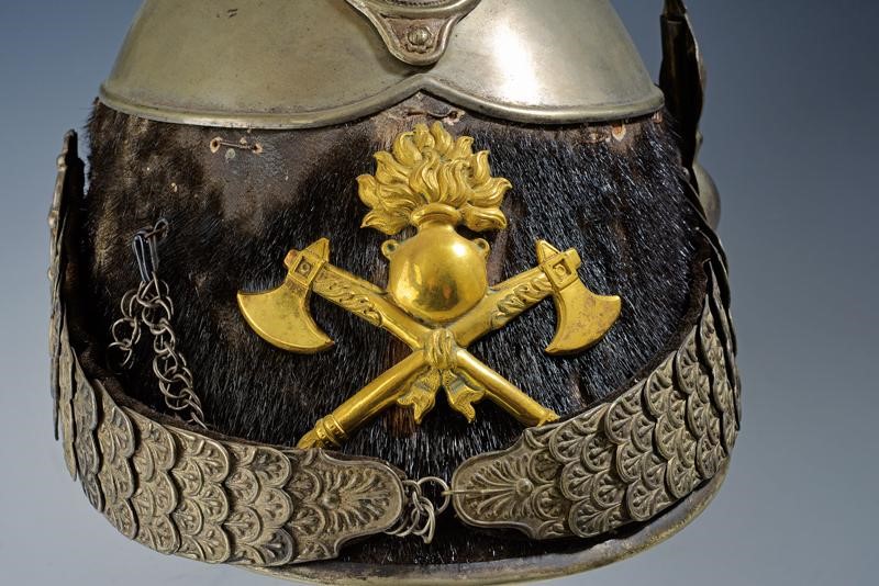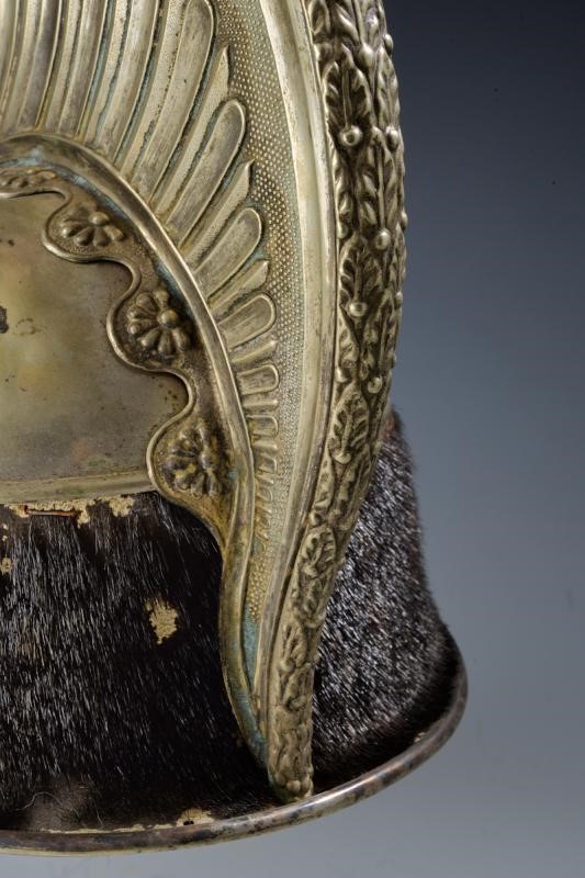 Coppo in argento (?), turbante originale in pelliccia (mancanze), cimiero in argento con oliva recante una cornucopia fiammeggiante. Fregio frontale in ottone ben dorato con asce incrociate e granata fiammeggiante; grandi soggoli a squame; sul lato sinistro granata porta piumetto su coccarda tricolore in seta. All'interno visiere rivestite in marocchino verde zigrinato, alluda in pelle marrone recante le cifre "G.G." scritte con inchiostro in corsivo.