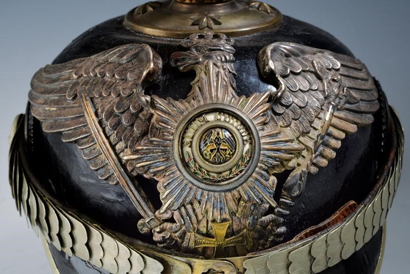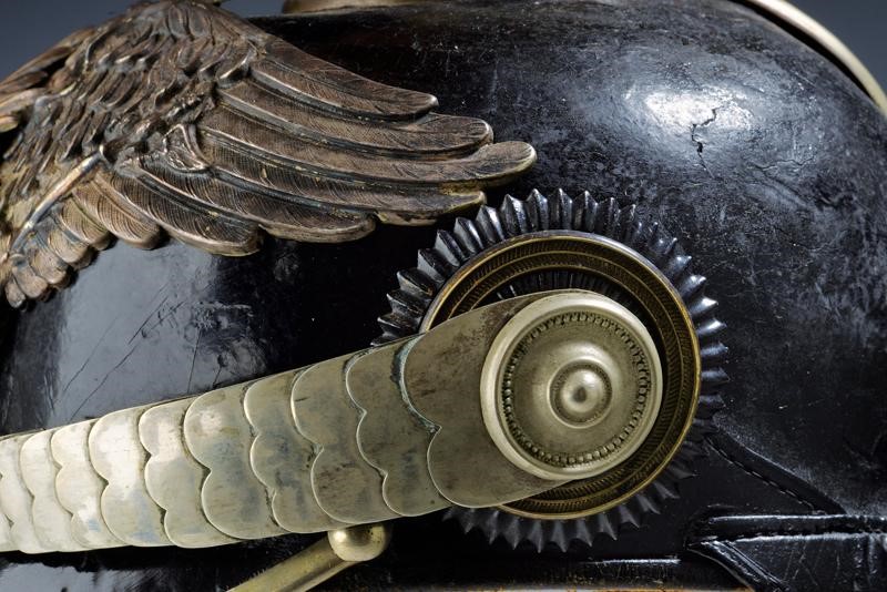 Coppo in cuoio bollito (la superficie leggermente crepata), puntale scanalato su disco in argento, grande aquila in argento recante stella dell'Aquila Nera parzialmente smaltata: Soggoli piatti color argento (la doratura non più visibile), entrambe le coccarde presenti. Fodera in seta danneggiata. Bella patina.