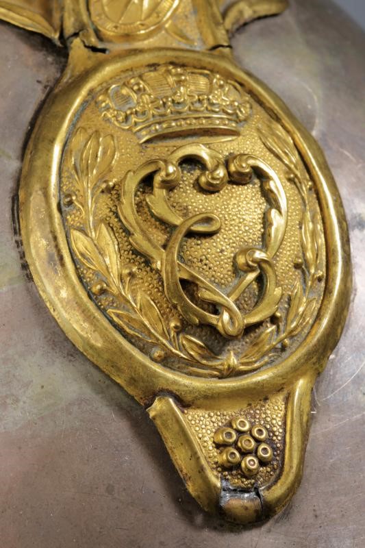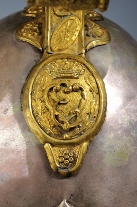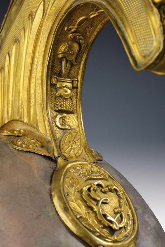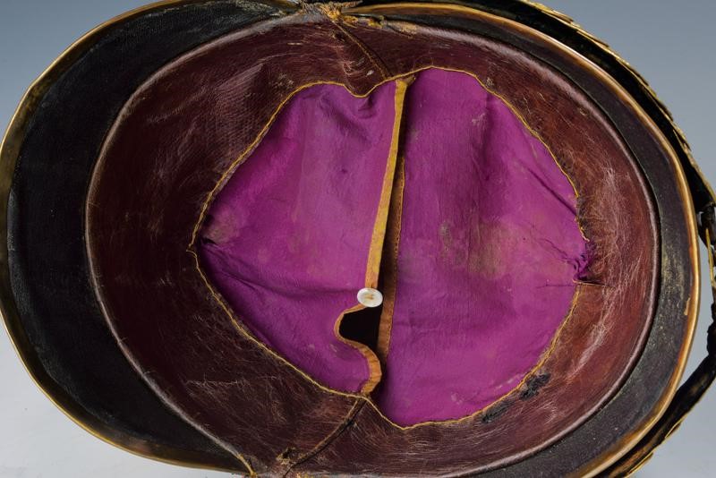 Coppo in argento (piccole imperfezioni) con turbante in pelliccia (phoca vitulina, mancanze), fregio bombato a croce sabauda. Cimiero in buone condizioni con cresta in ottone dorato e finemente cesellato, recante testa di leone sbalzata (piccola ammaccatura) e, alla base, oliva (due piccole rotture) con il monogramma "VE" coronato. Soggoli grandi, corazzati con placche in ottone; internamente in velluto. Sul lato sinistro coccarda tricolore in seta e canutiglia. All'interno alluda in pelle (danni d'uso e del tempo) e cuffia in seta viola.