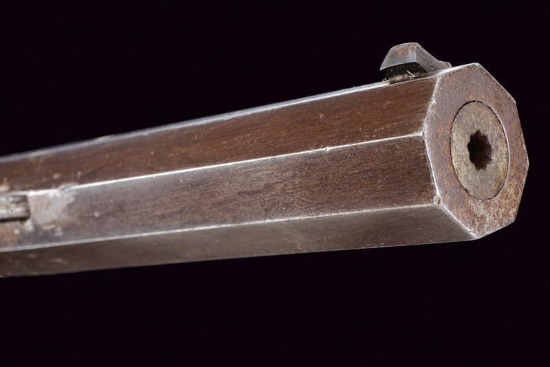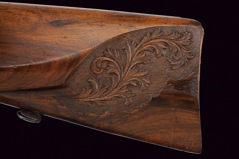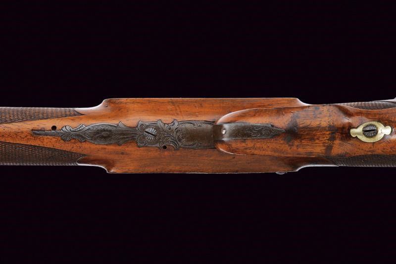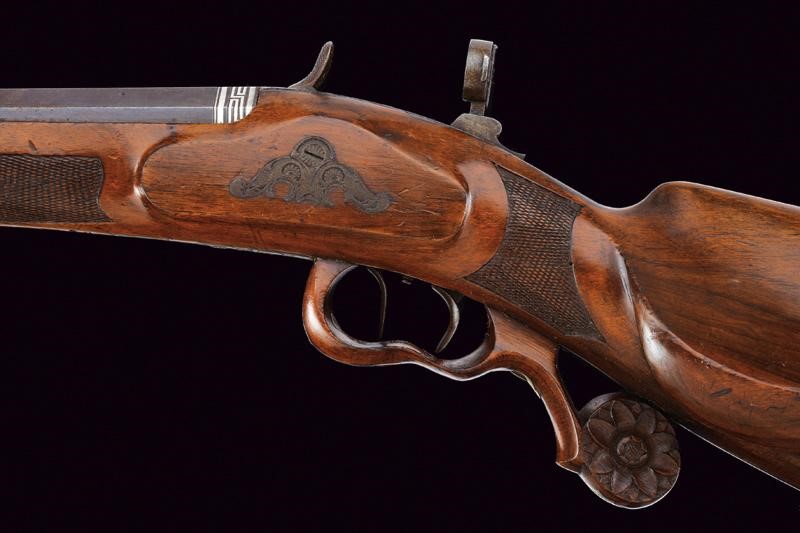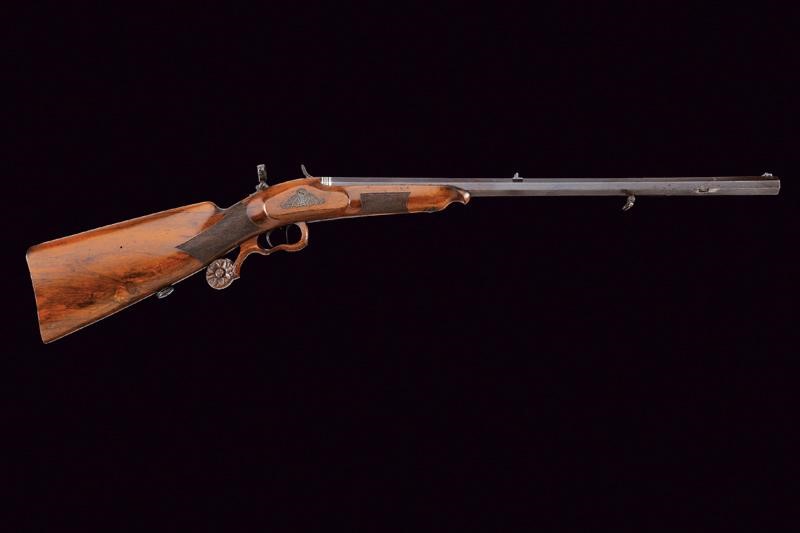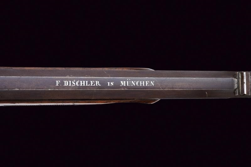 Pesante canna ottagonale rigata, con culatta ornata da una greca in argento e recante firma "F. DISCHLER IN MÜNCHEN" sempre in argento, dotata di alzo e mirino di precisione; cal. 5 mm. Il cane incassato nella codetta, la quale è anche finemente incisa a motivi floreali e munita di diottra; il pistone si trova a circa 15 cm dalla volata, il cane quando azionato batte su un lunghissimo percussore. Tra pistone e volata è inserito un perno trasversale che non ostacola il corretto funzionamento della meccanica. Bella mezza cassa in legno con astina e collo zigrinati; la guancia sinistra scolpita a fogliame, il ponticello in legno decorato con una rosetta scolpita alla coda. Le piastre laterali, all'altezza del cane, incise a rocaille; il calciolo mancante. Stecher.