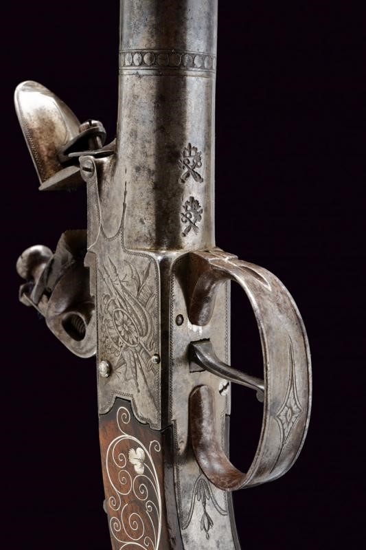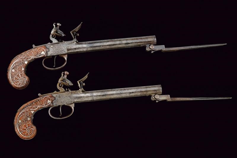 Canne tonde, lisce, svitabili, con cornici alle estremità, munite di punzoni del banco di prova, cal. 14 mm; entrambe munite sul lato inferiore di una baionetta a scatto. Castelli del tipo boxlock firmati "WHEELER" e maestosamente incisi a trofei. I cani al dorso, dotati di sicura incisa. Calci in legno riccamente ornati con decorazioni in filigrana d'argento. Entrambe le pistole con scudetto dorsale in argento al collo.