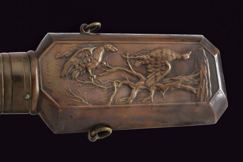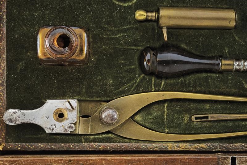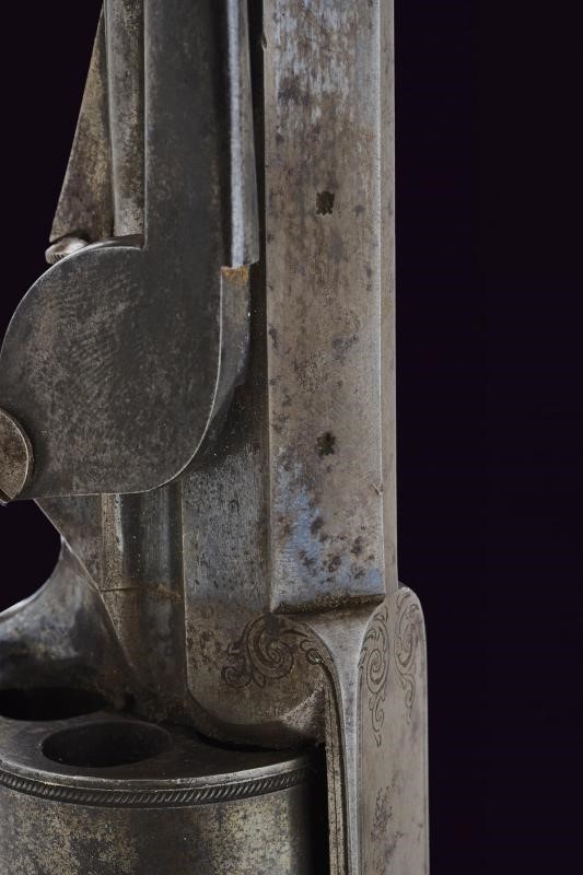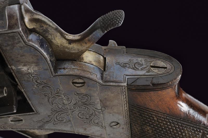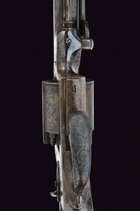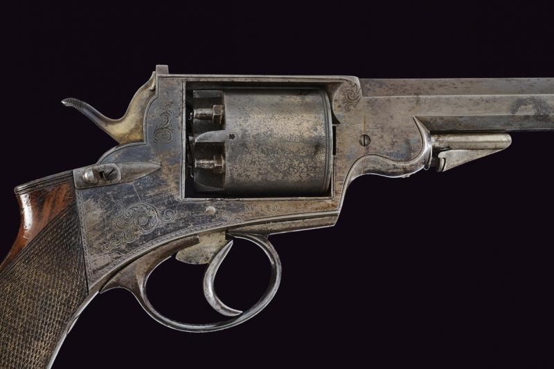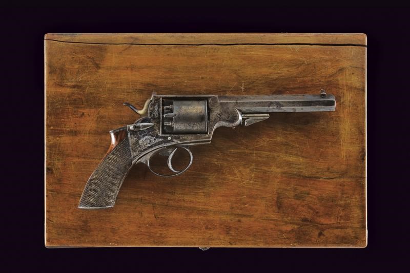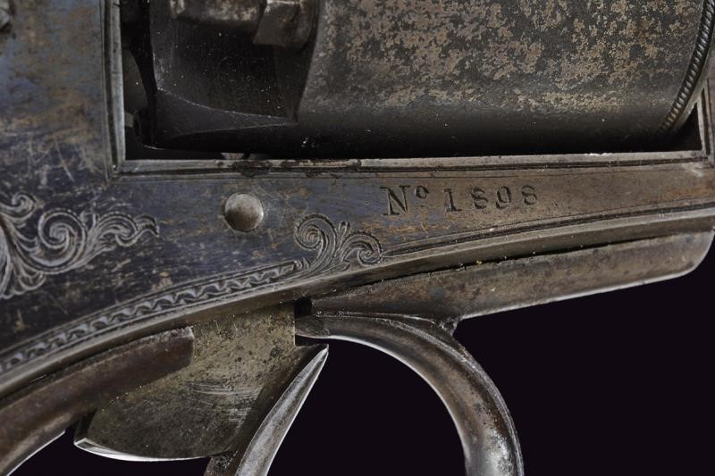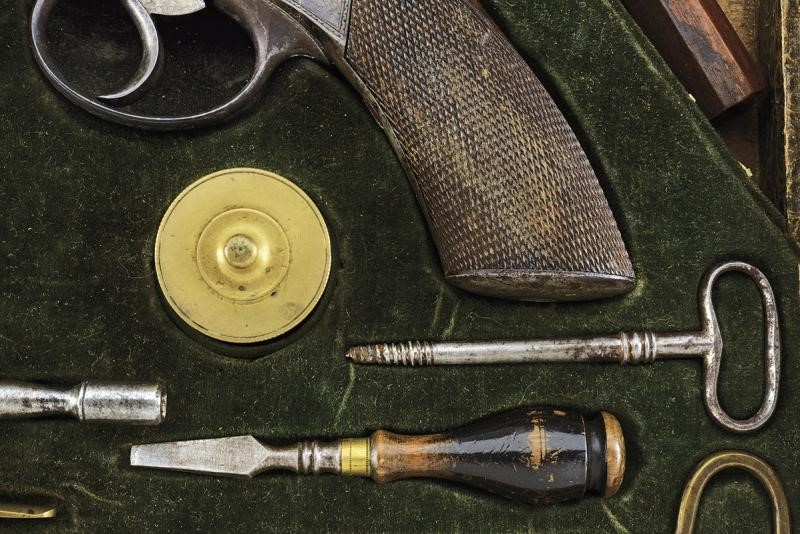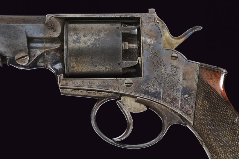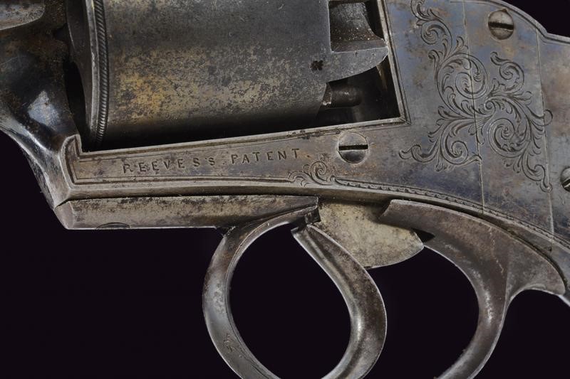 Canna rigata, ottagonale, con mirino, cal. 11 mm. Tamburo liscio a cinque colpi con bordi delineati e punzoni del banco di prova, castello marcato "REEVES'S PATENT" e "No. 1898". Calcatoio con perno mancante. Calcio in legno zigrinato. Brunitura ed incisioni a motivi floreali. Meccanica da rivedere. In patina, da pulire. Nella sua cassetta di legno foderata all'interno di velluto verde, completa di tutti gli attrezzi e della chiave, manca il coperchio del piccolo scomparto interno.