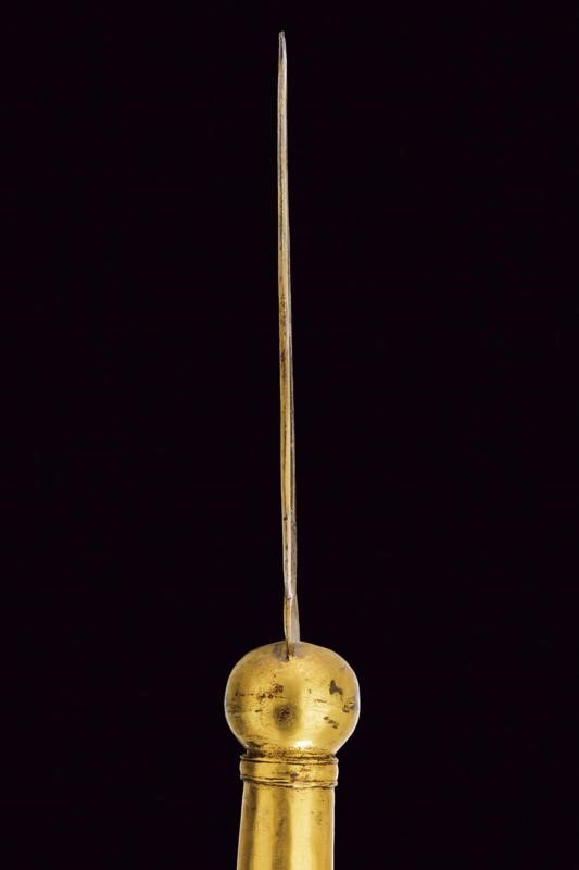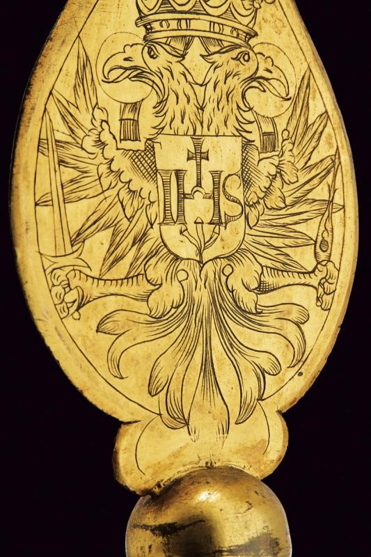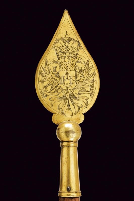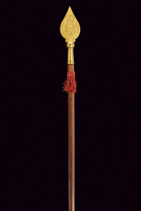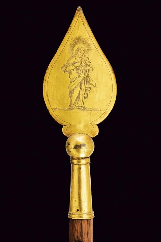 Larga cuspide appuntita a due fili, in bronzo dorato, la faccia anteriore incisa con aquila bicipite munita di scudetto con l'acronimo "IHS" sotto croce, la parte posteriore con Giuseppe che porta in braccio il Bambin Gesù. Nodo a sfera e gorbia troncoconica munita di anellature alle estremità. Montata su un'asta lignea di sezione ottagonale di epoca moderna, decorata con una nappa.