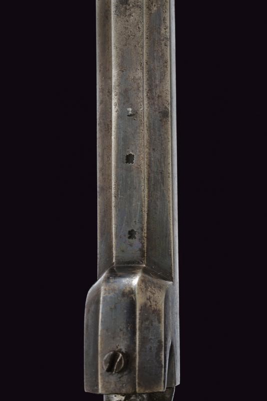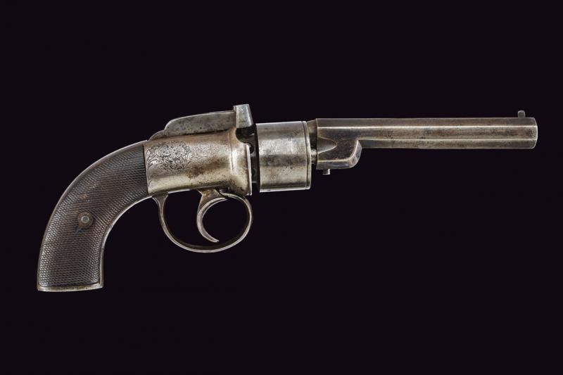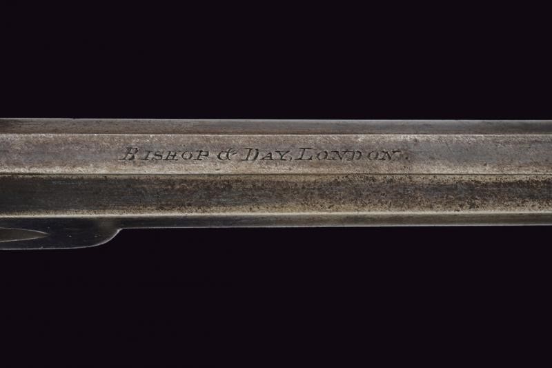 Canna ottagonale liscia, firmata "BISHOP & DAY LONDON", incisa alla volata e dotata di mirino, cal. 10 mm in volata. Tamburo a sei colpi con resti di incisioni a racemi. Meccanica funzionante. Percussore dorsale. Grilletto con ponticello. Castello inciso a motivi floreali. Guancette in legno zigrinato. Punzoni del banco di prova su canna e tamburo. Meccanica funzionante.