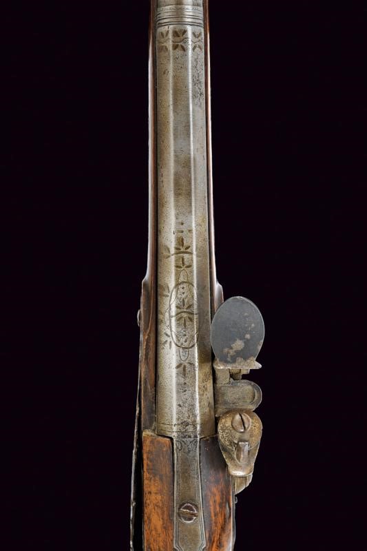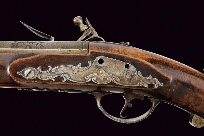 Canna liscia a due ordini, ottagonale nella prima parte e decorata a motivi floreali, con anellature al cambio, in seguito di sezione tonda. Volata con strombatura ellittica e con due cornici incise. Codetta a bordi delineati. Batteria a pietra focaia firmata "G.M. LOGGIA", la coda con incisone a tacche posizionata in modo quasi trasversale alla cartella; i bordi obliqui; manca una vite di fissaggio. Cassa intera in legno (piccoli difetti) con calcio leggermente più snello nella parte inferiore; manca un chiodo di fissaggio al muso. Bottone per il piegamento posto al dorso del collo. Fornimenti in ferro incisi a motivi floreali in bassorilievo; la contropiastra con vite di fissaggio mancante. Bacchetta in legno.