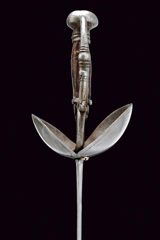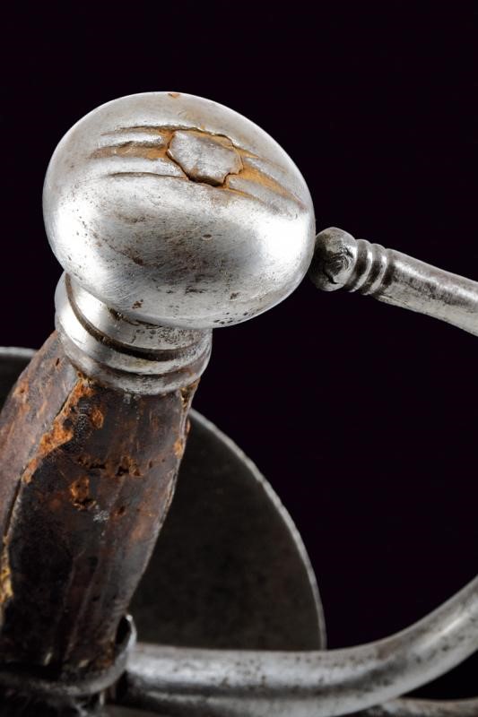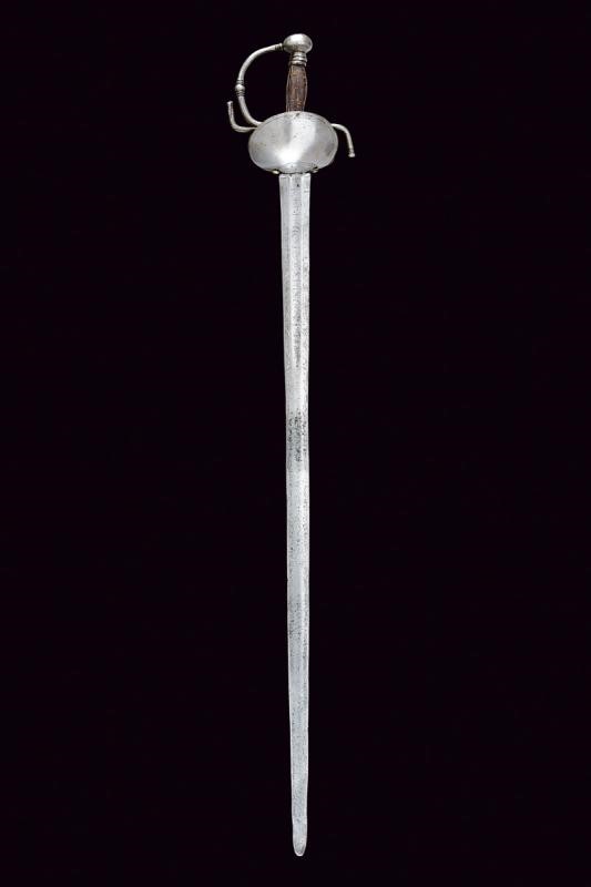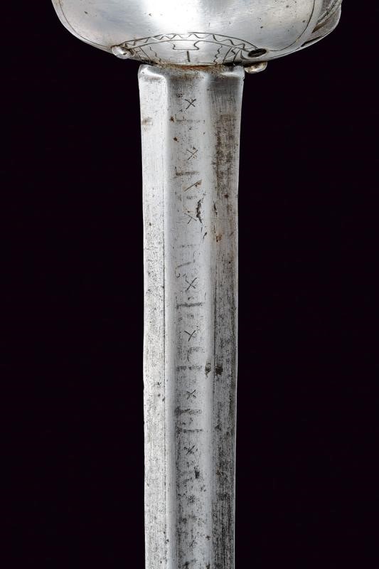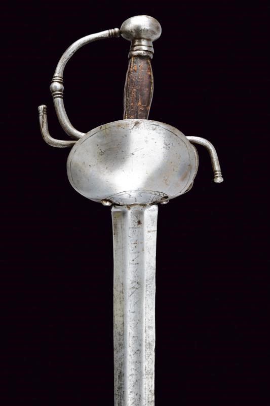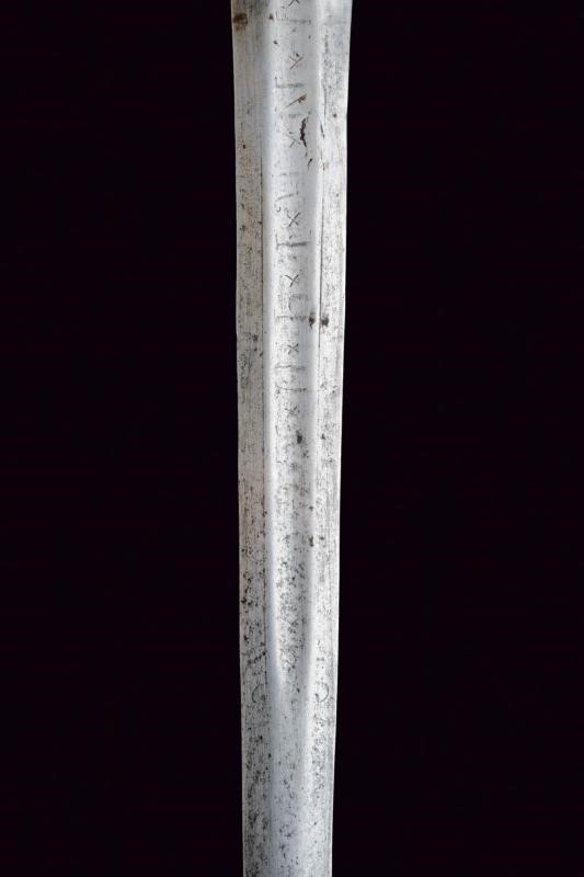 Lama dritta a due fili, sgusciata al centro al forte, recante nel primo segmento tracce di iscrizioni non più leggibili. Fornimento in ferro con tipica coccia a due ampie valve di taglia differente, entrambe incise alla base a motivi geometrici. Elso a bracci controcurvati e con archetti. Decori a nodi e anellature. Tipico pomo fungoide e impugnatura con rivestimento in pelle. Segni d'uso e del tempo.