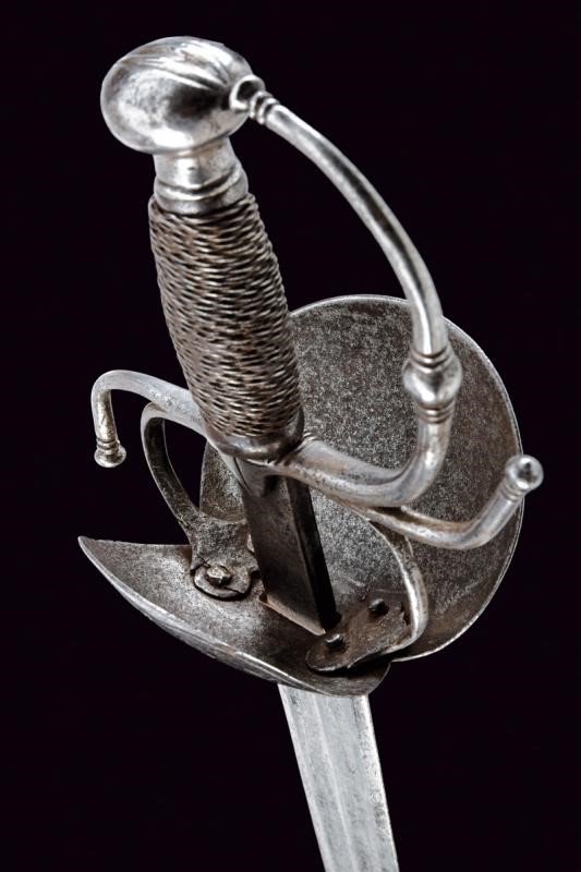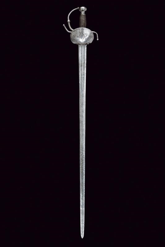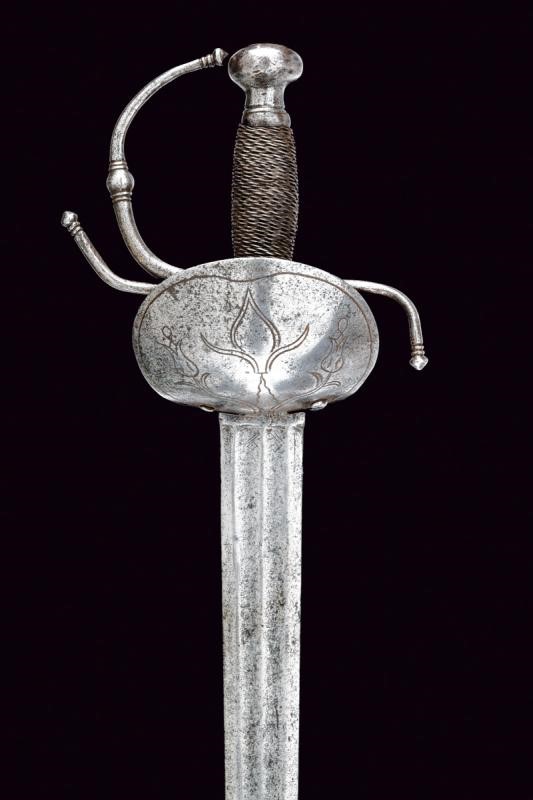 Lama a due fili di sezione lenticolare, con base munita di due leggere sgusciature e con resti di incisioni. Breve tallone. Fornimento in ferro con coccia a due valve di diversa grandezza incise a motivi floreali, elso con bracci a "S", e con estremità a piccoli nodi, come anche il ramo di guardia. Pomo a lenticchia con collo ristretto. Impugnatura in legno rivestita con trecciola in filo di ferro.