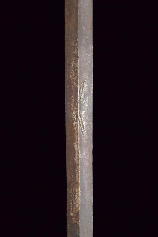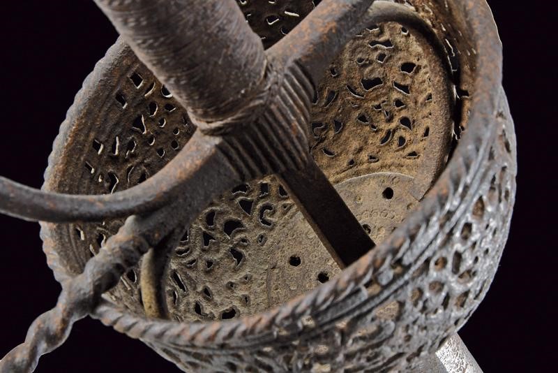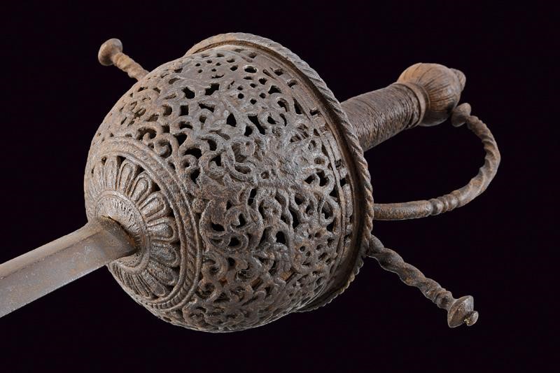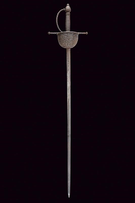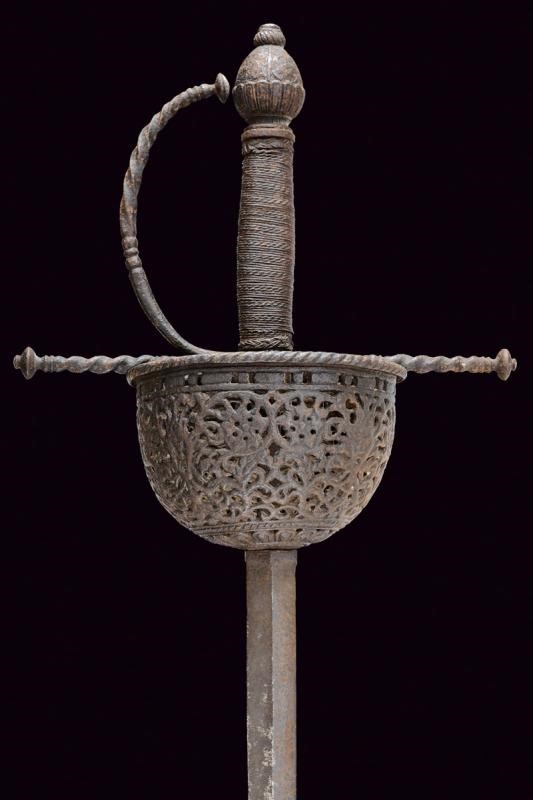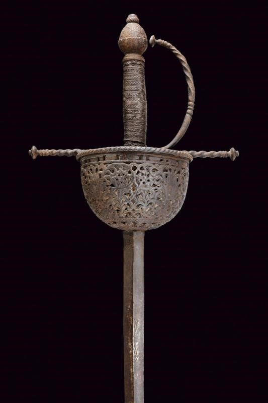 Lama dritta a due fili, a sezione di losanga, recante al forte il Lupo di Passau. Fornimento in ferro con tazza riccamente traforata a motivi floreali e geometrici, il bordo sporgente e lavorato a fingere il tortiglione, contropiastra a disco con trafori all'interno. Bracci dell'elso dritti e lavorati a spire con estremità a lenticchia, come anche il ramo di guardia. Pomo intagliato a germoglio. Impugnatura in legno rivestita con trecciola e dotata di teste di moro in filo di ferro. Tutto il fornimento in patina scura.