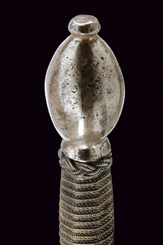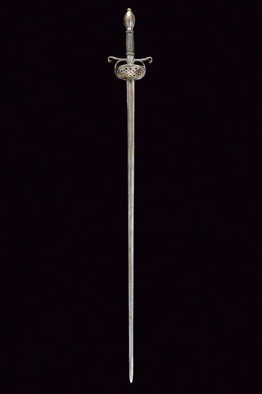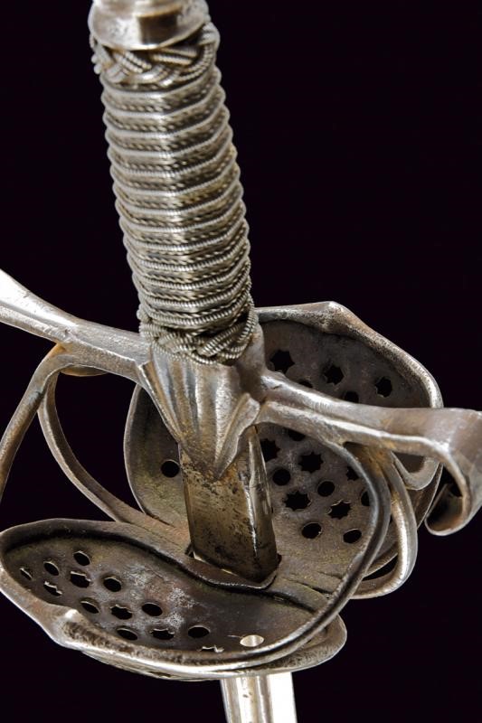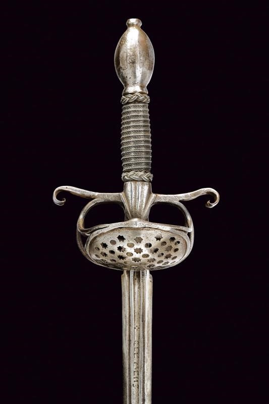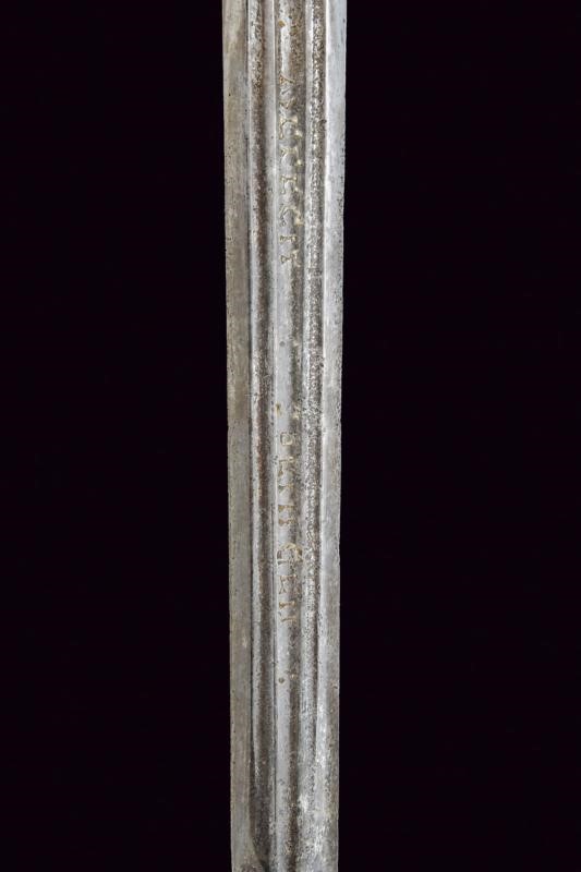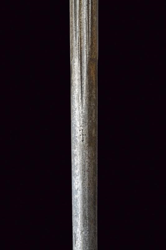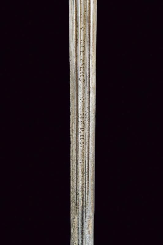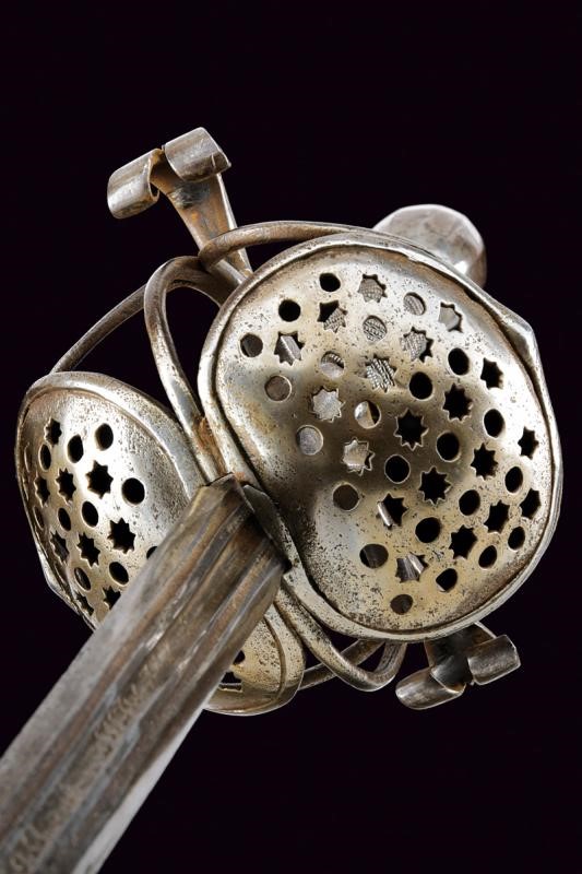 Lunga lama dritta di sezione quasi lenticolare, scanalata al forte, con firma "CLEMENS HORNN ME FECIT SOLINGEN". Ricasso rettangolare. Fornimento in ferro con doppia valva riccamente traforata a cerchi e stelle. Bracci dell'elso fortemente allargati alle estremità, a ricciolo con spacco al centro. Massello appuntito e decorato a scanalature. Elegante pomo ovoidale faccettato. Impugnatura in legno rivestita con trecciola e dotata di teste di moro in filo di ferro.