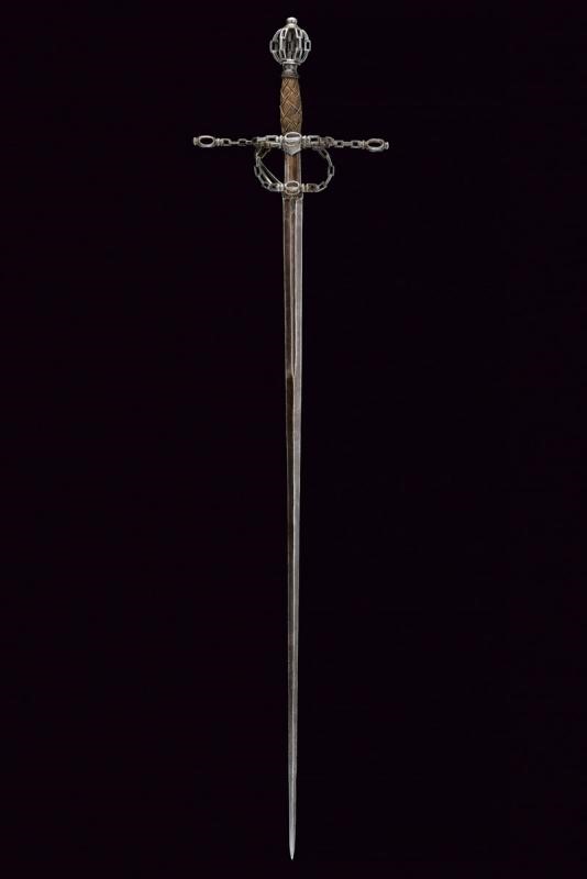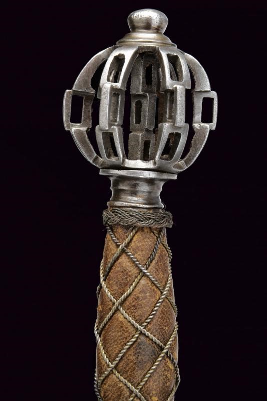 Lunga lama dritta a due fili con base scanalata, in seguito di sezione a losanga. Ricasso rettangolare scanalato su entrambi i lati. Bel fornimento in ferro con classico ponticello, il tutto decorato a traforo con segmenti a catena. Impugnatura in legno rivestita di cuoio con trecciola e teste di moro in filo metallico.