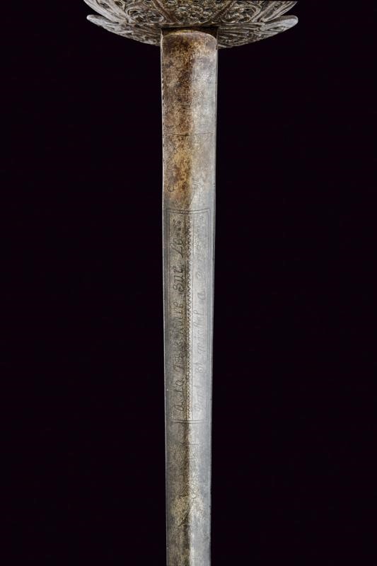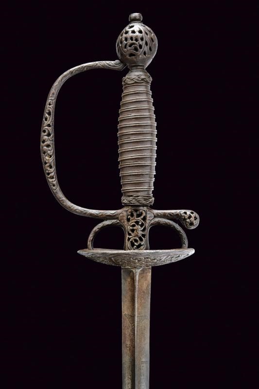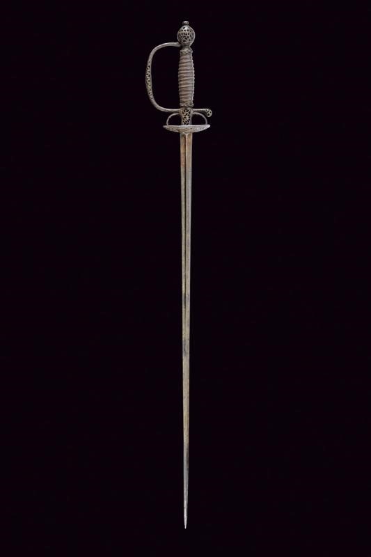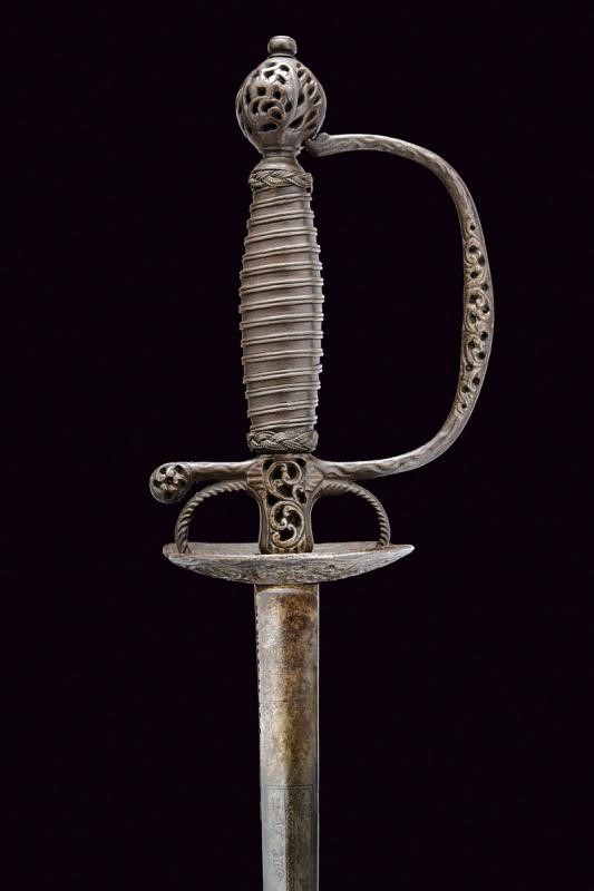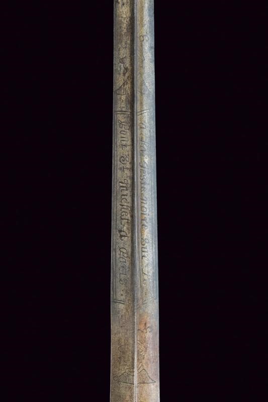 Lama dritta di sezione triangolare a facce incavate, con iscrizione alla base "a la Teste noire sur la Pont St. Michel a Paris" tra busti di ussari. Fornimento annerito in ferro, riccamente traforato a motivi floreali. Impugnatura in legno rivestita con bande, trecciole e teste di moro in filo di ferro.